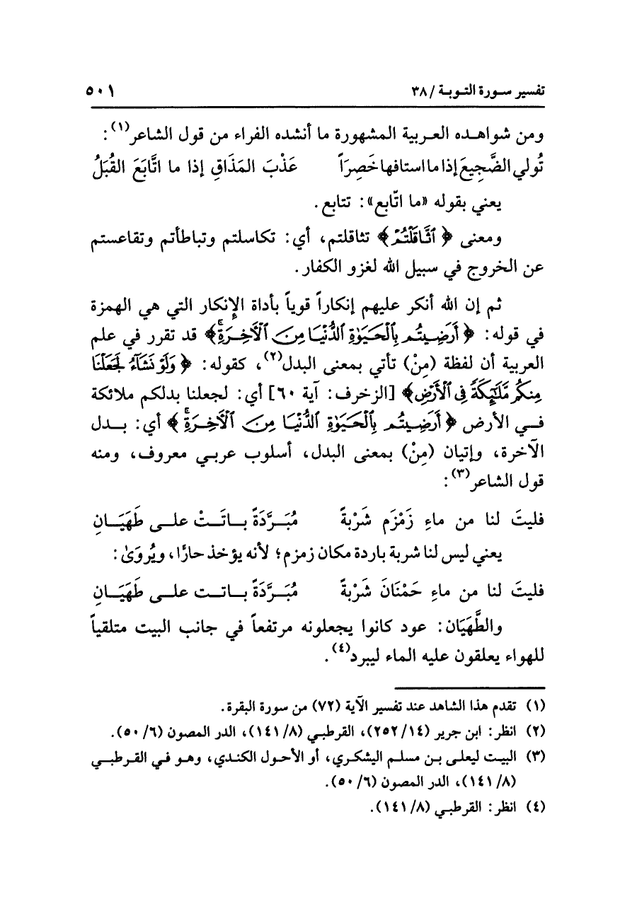 ثم إن اللَّهَ أَنْكَرَ عليهم إنكارًا قويًّا بأداةِ الإنكارِ التي هي الهمزةُ في قولِه: {أَرَضِيتُمْ بِالْحَيَاةِ الدُّنْيَا مِنَ الآخِرَةِ} قد تَقَرَّرَ في عِلْمِ العربيةِ أن لفظةَ (مِنْ) تأتِي بمعنَى البدلِ (¬٢)، كقولِه: {وَلَوْ نَشَاءُ لَجَعَلْنَا مِنْكُم مَّلَائِكَةً فِي الْأَرْضِ} [الزخرف: آية ٦٠] أي: لَجَعَلْنَا بَدَلَكُمْ ملائكةً في الأرضِ {أَرَضِيتُمْ بِالْحَيَاةِ الدُّنْيَا مِنَ الآخِرَةِ} أي: بدلَ الآخرةِ، وإتيانُ (مِنْ) بمعنَى البدلِ، أسلوبٌ عربيٌّ معروفٌ، ومنه قولُ الشاعرِ (¬٣):