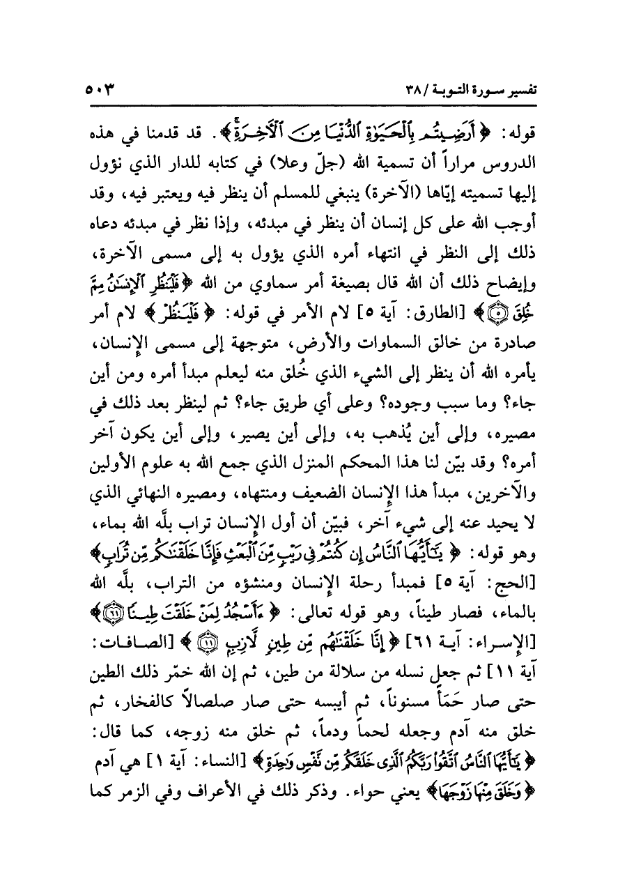 قولِه: {أَرَضِيتُمْ بِالْحَيَاةِ الدُّنْيَا مِنَ الآخِرَةِ}. قد قَدَّمْنَا في هذه الدروسِ مِرَارًا أن تسميةَ اللَّهِ (جلَّ وعلا) في كتابِه للدارِ الذي نَؤُولُ إليها تسميته إِيَّاهَا (الآخرة) ينبغي للمسلمِ أن ينظرَ فيه ويعتبرَ فيه، وقد أَوْجَبَ اللَّهُ على كلِّ إنسانٍ أن ينظرَ في مبدئِه، وإذا نَظَرَ في مبدئِه دَعَاهُ ذلك إلى النظرِ في انتهاءِ أَمْرِهِ الذي يَؤُولُ به إلى مُسَمَّى الآخرةِ، وإيضاحُ ذلك أن اللَّهَ قال بصيغةِ أَمْرٍ سَمَاوِيٍّ من اللَّهِ {فَلْيَنْظُرِ الْإِنسَانُ مِمَّ خُلِقَ (٥)} [الطارق: آية ٥] لامُ الأمرِ في قولِه: {فَلْيَنْظُرِ} لامُ أمرٍ صادرةٌ مِنْ خَالِقِ السماواتِ والأرضِ، متوجهةً إلى مُسَمَّى الإنسانِ، يأمرُه اللَّهُ أن ينظرَ إلى الشيءِ الذي خُلِقَ منه ليعلمَ مبدأَ أمرِه وَمِنْ أينَ جَاءَ؟ وما سببُ وجودِه؟ وعلى أَيِّ طريقٍ جَاءَ؟ ثُمَّ ليَنْظُرْ بعدَ ذلك في مصيرِه، وإلى أين يُذْهَبُ به، وإلى أين يَصِيرُ، وإلى أين يكونُ آخِرُ أَمْرِهِ؟ وقد بَيَّنَ لنا هذا المحكمَ المنزلَ الذي جَمَعَ اللَّهُ به علومَ الأولينَ والآخرينَ، مبدأُ هذا الإنسانِ الضعيفِ ومنتهاه، ومصيرُه النهائيُّ الذي لا يحيدُ عنه إلى شيءٍ آخَرَ، فَبَيَّنَ أن أولَ الإنسانِ ترابٌ بَلَّهُ اللَّهُ بماءٍ، وهو قولُه: {يَا أَيُّهَا النَّاسُ إِنْ كُنْتُمْ فِي رَيْبٍ مِّنَ الْبَعْثِ فَإِنَّا خَلَقْنَاكُم مِّنْ تُرَابٍ} [الحج: آية ٥] فمبدأُ رحلةِ الإنسانِ ومنشؤُه من الترابِ، بَلَّهُ اللَّهُ بالماءِ، فصارَ طِينًا، وهو قولُه تعالى: {أَأَسْجُدُ لِمَنْ خَلَقْتَ طِينًا} [الإسراء: آية ٦١] {إِنَّا خَلَقْنَاهُم مِّنْ طِينٍ لَاّزِبٍ} [الصافات: آية ١١] ثم جَعَلَ نسلَه من سلالةٍ من طِينٍ، ثم إن الله خَمَّرَ ذلك الطينَ حتى صَارَ حَمَأً مَسْنُونًا، ثم أَيْبَسَهُ حتى صَارَ صلصالاً كالفخارِ، ثم خَلَقَ منه آدمَ وجعلَه لَحْمًا وَدَمًا، ثم خَلَقَ منه زوجَه، كما قال: {يَا أَيُّهَا النَّاسُ اتَّقُوا رَبَّكُمُ الَّذِي خَلَقَكُم مِّن نَّفْسٍ وَاحِدَةٍ}