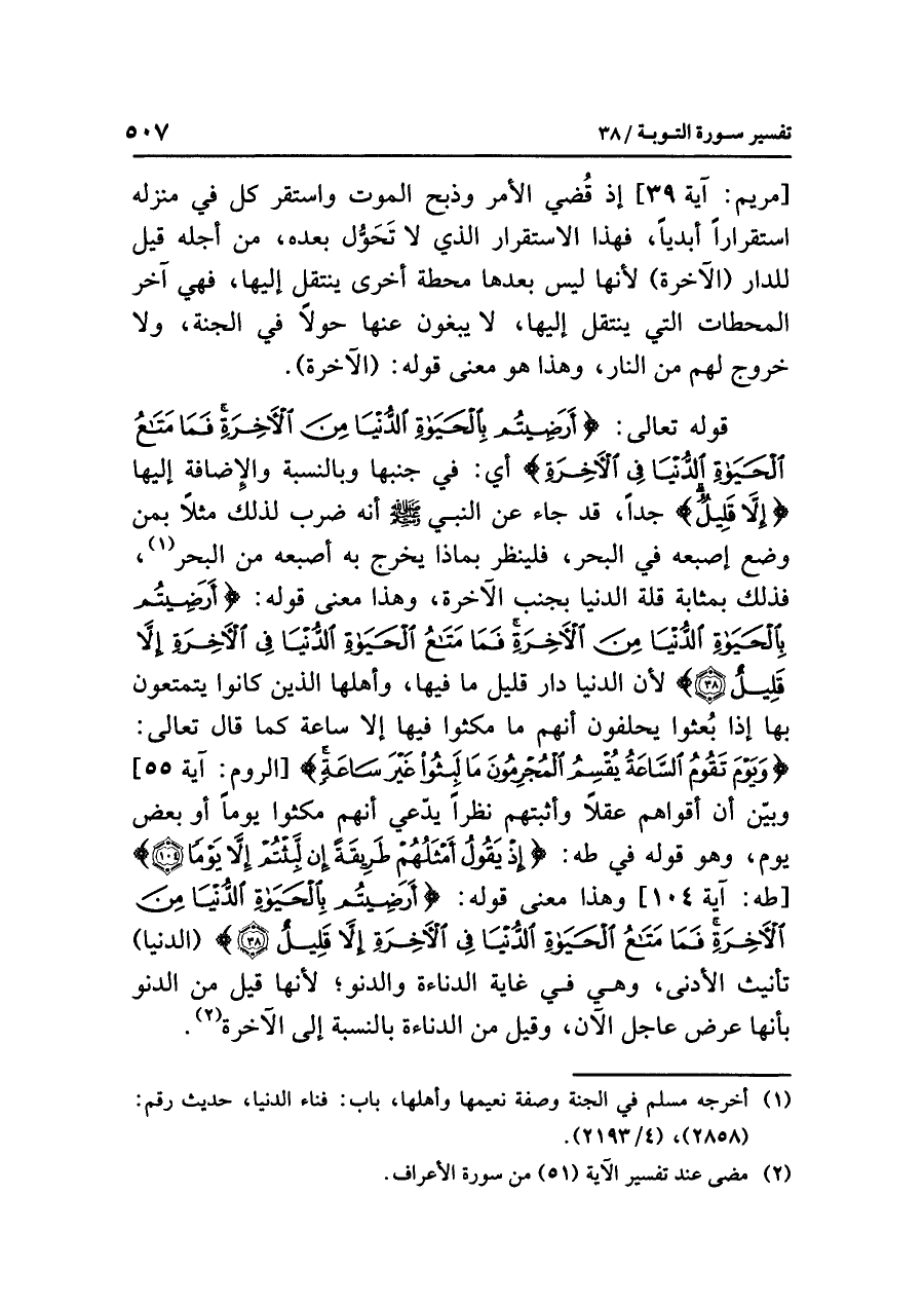 قولُه تعالى: {أَرَضِيتُمْ بِالْحَيَاةِ الدُّنْيَا مِنَ الآخِرَةِ فَمَا مَتَاعُ الْحَيَاةِ الدُّنْيَا فِي الآخِرَةِ} أي: في جنبِها وبالنسبةِ والإضافةِ إليها {إِلَاّ قَلِيلٌ} جِدًّا، قد جاء عن النبيِّ صلى الله عليه وسلم أنه ضَرَبَ لذلك مَثَلاً بِمَنْ وَضَعَ إصبعَه في البحرِ، فَلْيَنْظُرْ بماذا يخرجُ به أصبعُه من البحرِ (¬١)، فذلك بمثابةِ قلةِ الدنيا بجنبِ الآخرةِ، وهذا معنَى قولِه: {أَرَضِيتُمْ بِالْحَيَاةِ الدُّنْيَا مِنَ الآخِرَةِ فَمَا مَتَاعُ الْحَيَاةِ الدُّنْيَا فِي الآخِرَةِ إِلَاّ قَلِيلٌ} لأَنَّ الدنيا دارٌ قليلٌ ما فيها، وأهلُها الذين كانوا يتمتعونَ بها إذا بُعِثُوا يحلفونَ أنهم ما مَكَثُوا فيها إلا ساعةً كما قال تعالى: {وَيَوْمَ تَقُومُ السَّاعَةُ يُقْسِمُ الْمُجْرِمُونَ مَا لَبِثُوا غَيْرَ سَاعَةٍ} [الروم: آية ٥٥] وَبَيَّنَ أن أقواهم عقلاً وأثبتَهم نظرًا يَدَّعِي أنهم مَكَثُوا يومًا أو بعضَ يومٍ، وهو قولُه في (طه): {إِذْ يَقُولُ أَمْثَلُهُمْ طَرِيقَةً إِن لَّبِثْتُمْ إِلَاّ يَوْمًا} [طه: آية ١٠٤] وهذا معنَى قولِه: {أَرَضِيتُمْ بِالْحَيَاةِ الدُّنْيَا مِنَ الآخِرَةِ فَمَا مَتَاعُ الْحَيَاةِ الدُّنْيَا فِي الآخِرَةِ إِلَاّ قَلِيلٌ} (الدنيا) تأنيثُ الأَدْنَى، وهي في غايةِ الدناءةِ والدنوِّ؛ لأنها قِيلَ من الدنوِّ بأنها عَرَضٌ عاجلٌ الآنَ، وقيل من الدناءةِ بالنسبةِ إلى الآخرةِ (¬٢).
