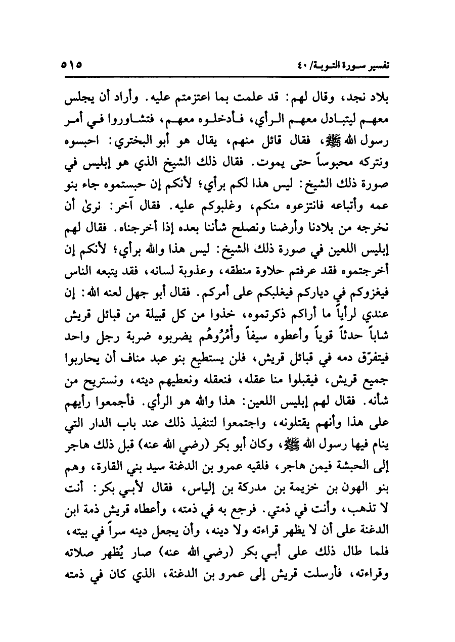 بلادِ نَجْدٍ، وقال لهم: قد علمتُ بما اعتزمتُم عليه. وَأَرَادَ أن يجلسَ معهم ليتبادلَ معهم الرأيَ، أَدْخَلُوهُ معهم، فَتَشَاوَرُوا في أمرِ رسولِ اللَّهِ صلى الله عليه وسلم، فقال قائلٌ منهم، يقال هو أبو البختريِّ: احْبِسُوهُ وَنَتْرُكُهُ مَحْبُوسًا حتى يموتَ. فقال ذلك الشيخُ الذي هو إبليسُ في صورةِ ذلك الشيخِ: ليس هذا لكم بِرَأْيٍ؛ لأنكم إن حبستموه جاء بَنُو عَمِّهِ وأتباعُه فَانْتَزَعُوهُ منكم، وَغَلَبُوكُمْ عليه. فقال آخَرُ: نرى أن نخرجَه من بلادِنا وأرضِنا ونصلحَ شأنَنا بعدَه إذا أَخْرَجْنَاهُ. فقال لهم إبليسُ اللعينُ في صورةِ ذلك الشيخِ: ليس هذا وَاللَّهِ بِرَأْيٍ؛ لأنكم إن أَخْرَجْتُمُوهُ فقد عرفتُم حلاوةَ منطقِه، وعذوبةَ لسانِه، فقد يَتْبَعُهُ الناسُ فيغزوكم في ديارِكم فيغلبَكم على أَمْرِكُمْ.