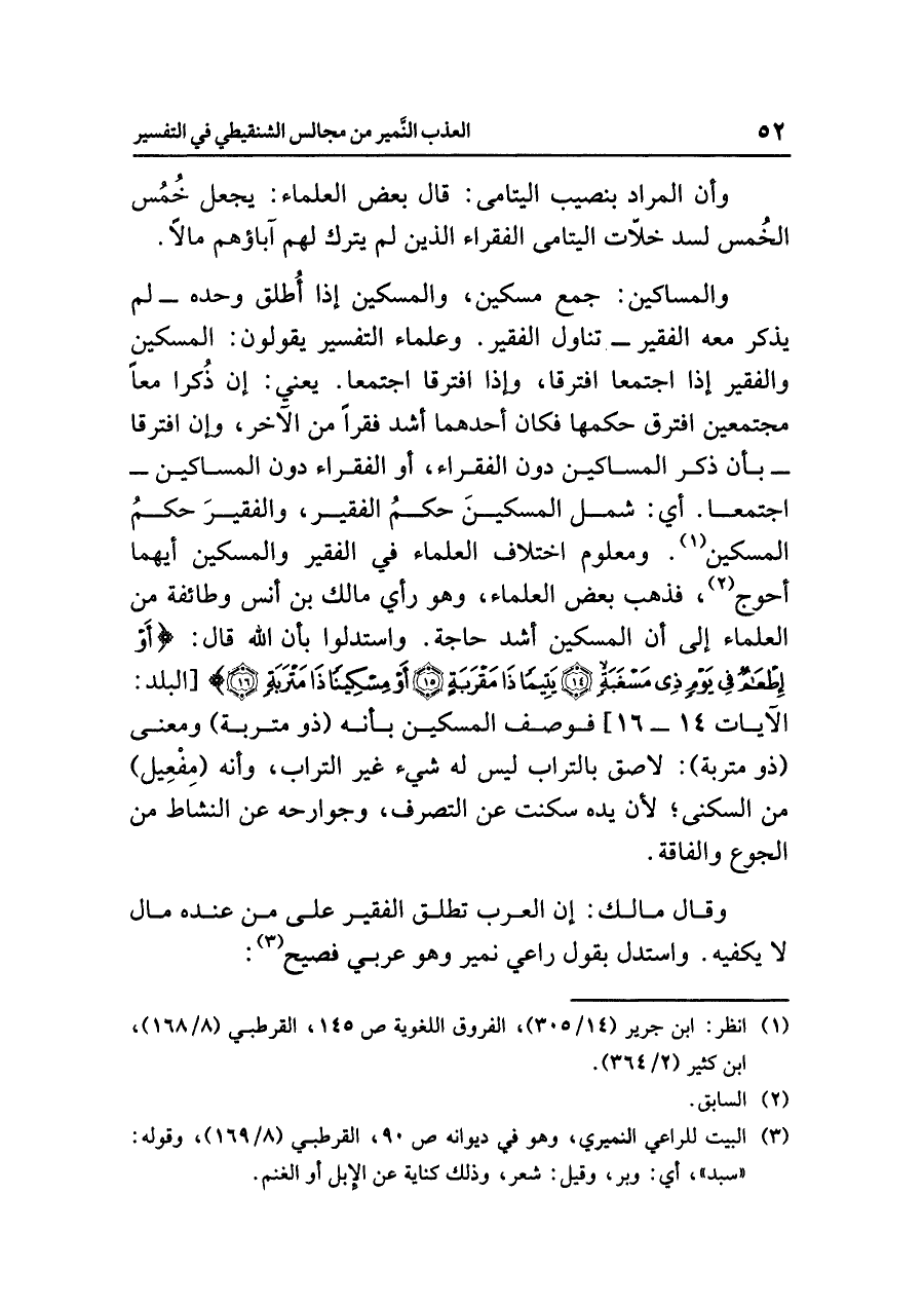 والمساكين: جمع مسكين، والمسكين إذا أُطْلِقَ وَحْدَهُ -لم يذكر معه الفقير- تناول الفقير، وعلماء التفسير يقولون: المسكين والفقير إذا اجتمعا افترقا، وإذا افترقا اجتمعا. يعني: إن ذُكرا معاً مجتمعين افترق حكمهما فكان أحدهما أشَدّ فقراً من الآخر، وإن افترقا -بأن ذكر المساكين دون الفقراء -أو الفقراء دون المساكين- اجتمعا. أي: شَمِلَ المسْكِينَ حكمُ الفقير، والفقيرَ حكمُ المسكين (¬١). ومعلوم اختلاف العلماء في الفقير والمسكين أيهما أحوج (¬٢)، فذهب بعض العلماء، وهو رأي مالك بن أنس وطائفة من العلماء إلى أن المسكين أشد حاجة. واستدلوا بأن الله قال: {أَوْ إِطْعَامٌ فِي يَوْمٍ ذِي مَسْغَبَةٍ (١٤) يَتِيماً ذَا مَقْرَبَةٍ (١٥) أَوْ مِسْكِيناً ذَا مَتْرَبَةٍ (١٦)} [البلد: الآيات ١٤ - ١٦] فوصف المسكين بأنه (ذو متربة) ومعنى (ذو متربة): لاصق بالتراب ليس له شيء غير التراب، وأنه (مِفْعِيل) من السكنى؛ لأن يده سكنت عن التصرف، وجوارحه عن النشاط من الجوع والفاقة.