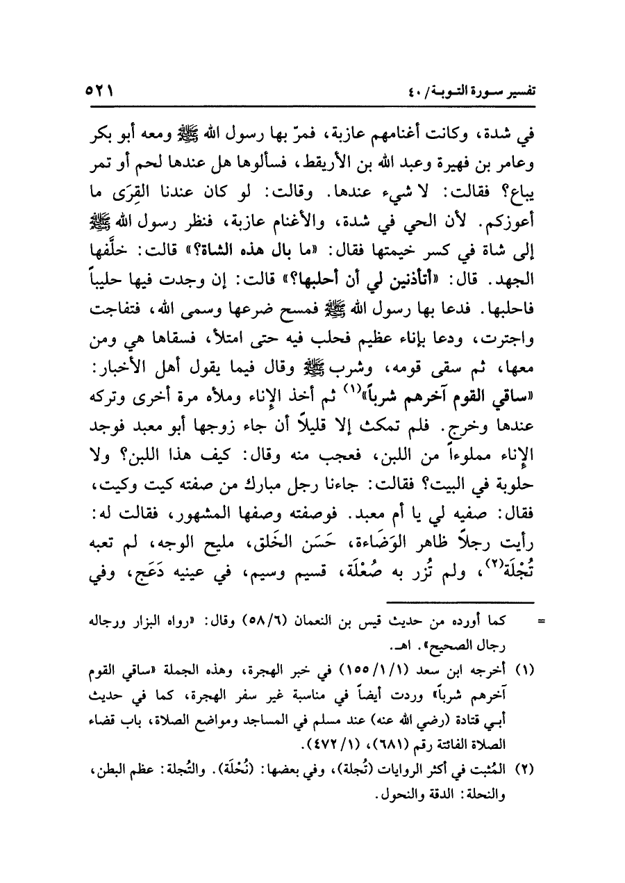 في شِدَّةٍ، وكانت أغنامُهم عازبةً، فَمَرَّ بها رسولُ اللَّهِ صلى الله عليه وسلم ومعه أبو بكر وعامرُ بنُ فهيرةَ وعبدُ اللَّهِ بنُ الأريقطِ، فسألوها هل عندها لحمٌ أو تَمْرٌ يُبَاعُ؟ فقالت: لا شيءَ عندها. وقالت: لو كان عندنا القِرَى ما أَعْوَزَكُمْ؛ لأن الْحَيَّ في شدةٍ، والأغنامُ عازبةٌ، فَنَظَرَ رسولُ الله صلى الله عليه وسلم إلى شاةٍ في كسرِ خيمتِها فقال: «مَا بَالُ هَذِهِ الشَّاةِ؟» قالت: خَلَّفَهَا الجهدُ. قال: «أَتَأْذَنِينَ لِي أَنْ أَحْلُبَهَا؟» قالت: إن وجدتَ فيها حليبًا فاحلبها. فدعا بها رسولُ اللَّهِ صلى الله عليه وسلم فَمَسَحَ ضرعَها وسمى الله، فَتَفَاجَّتْ وَاجْتَرَّتْ، ودعا بإناءٍ عظيمٍ فحلب فيه حتى امتلأ، فسقاها هي وَمَنْ معها، ثم سَقَى قَوْمَهُ، وشرب صلى الله عليه وسلم وقال فيما يقولُ أهلُ الأخبارِ: «سَاقِي الْقَوْمِ آخِرُهُمْ شُرْبًا» (¬١) ثم أخذَ الإناءَ وملأه مرةً أخرى وتركَه عندَها وخرجَ. فلم تَمْكُثْ إلا قليلاً أن جاء زوجُها أبو معبدٍ فوجدَ الإناءَ مملوءًا من اللبنِ، فعجب منه وقال: كيف هذا اللبنُ؟ ولا حلوبةَ في البيتِ؟ فقالت: جاءنا رجلٌ مباركٌ من صفتِه كيت وكيت، فقال: صِفِيهِ لِي يا أُمَّ مَعْبَدٍ. فَوَصَفَتْهُ وصفَها المشهورَ، فقالت له: رأيتُ رجلاً ظاهرَ الوَضَاءةِ، حَسَنَ الْخَلْقِ، مليحَ الوجهِ، لم تُعِبْهُ تُجْلَة (¬٢)، ولم تُزْرِ به صُعْلَةٌ، قَسِيمٌ وَسِيمٌ، في عَيْنَيْهِ دَعَجٌ، وفي