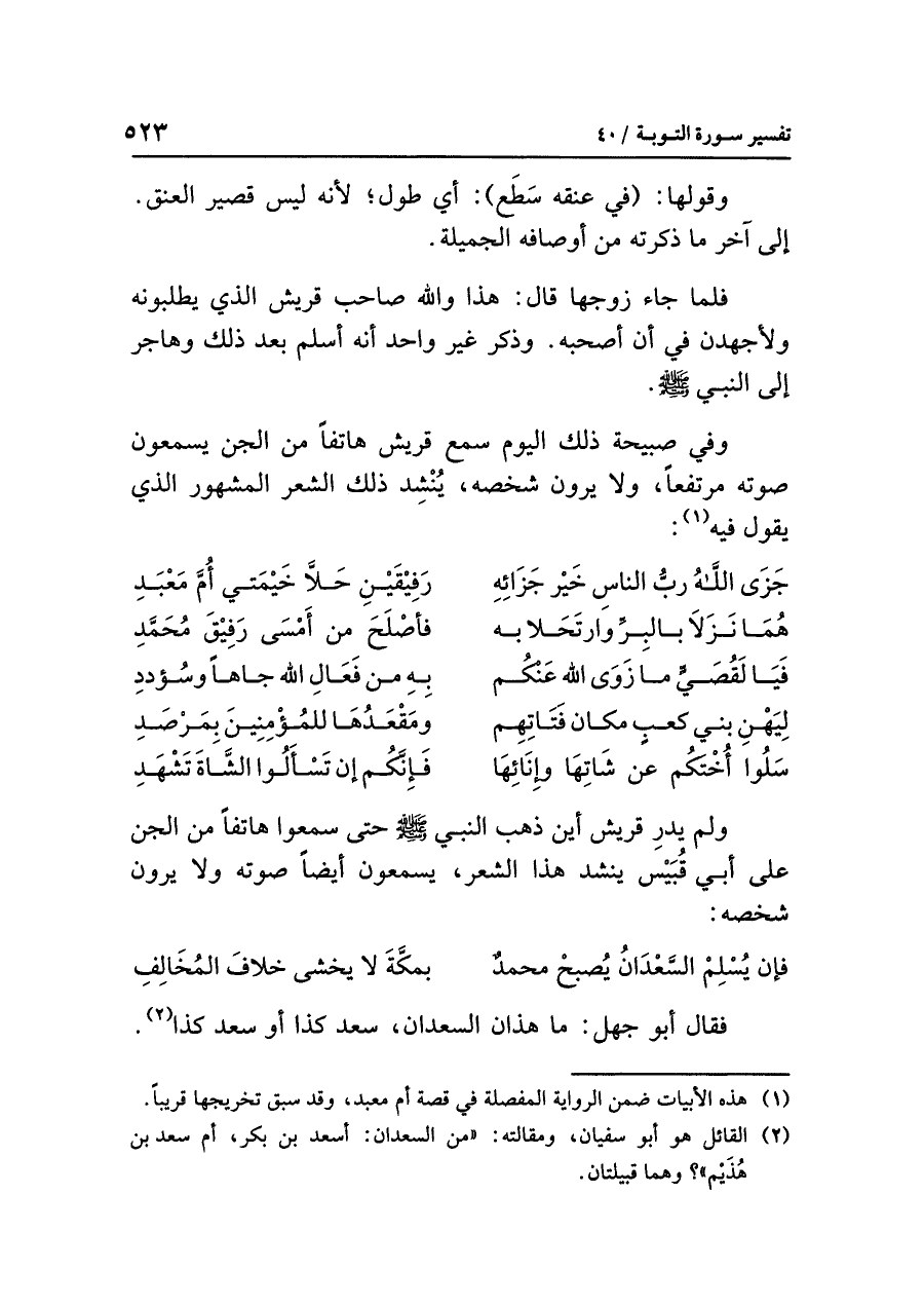 (¬١) هذه الأبيات ضمن الرواية المفصلة في قصة أم معبد، وقد سبق تخريجها قريبًا.