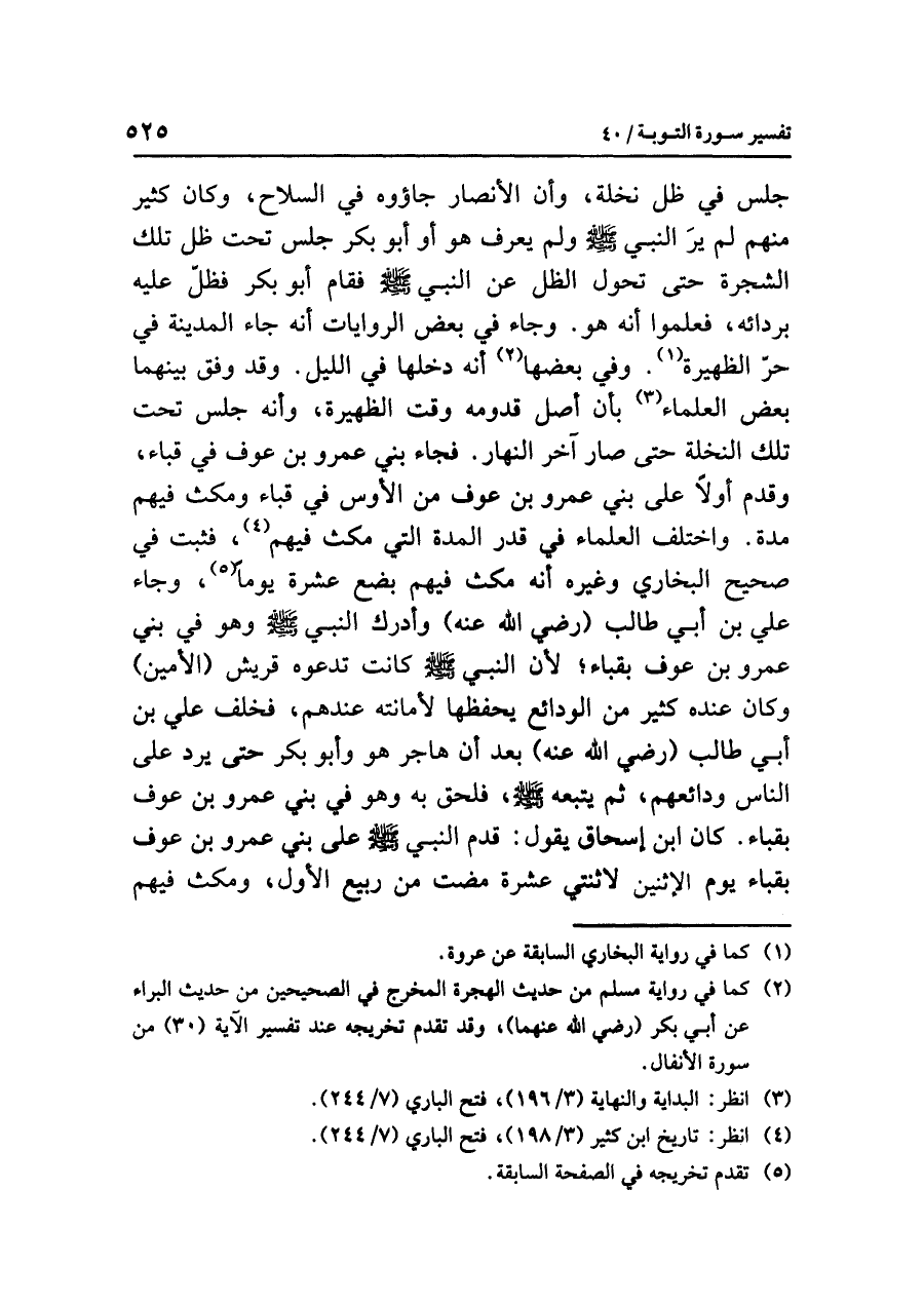 جَلَسَ في ظِلِّ نخلةٍ، وأن الأنصارَ جاؤوه في السلاحِ، وكان كثيرٌ منهم لم يَرَ النبيَّ صلى الله عليه وسلم ولم يَعْرِفْ هو أو أبو بكر جَلَسَ تحتَ ظِلِّ تلك الشجرةِ حتى تَحَوَّلَ الظلُّ عن النبيِّ صلى الله عليه وسلم فقام أبو بكر فَظَلَّ عليه بردائِه، فَعَلِمُوا أنه هو. وجاء في بعضِ الرواياتِ أنه جاء المدينةَ في حرِّ الظهيرةِ (¬١). وفي بعضها (¬٢) أنه دَخَلَهَا في الليلِ. وقد وَفَّقَ بينَهما بعضُ العلماءِ (¬٣) بأن أصلَ قدومِه وقتَ الظهيرةِ، وأنه جَلَسَ تحتَ تلك النخلةِ حتى صار آخِر النهارِ. فجاء بَنِي عمرِو بنِ عوفٍ في قباء، وَقَدِمَ أولاً على بَنِي عمرِو بن عوفٍ من الأوسِ في قباء وَمَكَثَ فيهم مدةً. واختلف العلماءُ في قَدْرِ المدةِ التي مَكَثَ فيهم (¬٤)، فَثَبَتَ في صحيحِ البخاريِّ وغيرِه أنه مَكَثَ فيهم بضعَ عشرةَ يومًا (¬٥)، وجاء عَلِيُّ بنُ أبِي طالبٍ (رضي الله عنه) وَأَدْرَكَ النبيَّ صلى الله عليه وسلم وهو في بني عمرِو بنِ عوفٍ بقباء؛ لأَنَّ النبيَّ صلى الله عليه وسلم كانت تدعوه قريشٌ (الأمينَ) وكان عنده كثيرٌ من الودائعِ يحفظُها لأمانتِه عندَهم، فَخَلَّفَ عليَّ بنَ أبِي طالبٍ (رضي الله عنه) بعد أن هاجر هو وأبو بكر حتى يَرُدَّ على الناس ودائعَهم، ثم يتبعه صلى الله عليه وسلم، فَلَحِقَ به وهو في بَنِي عمرِو بنِ عوفٍ بقباء.