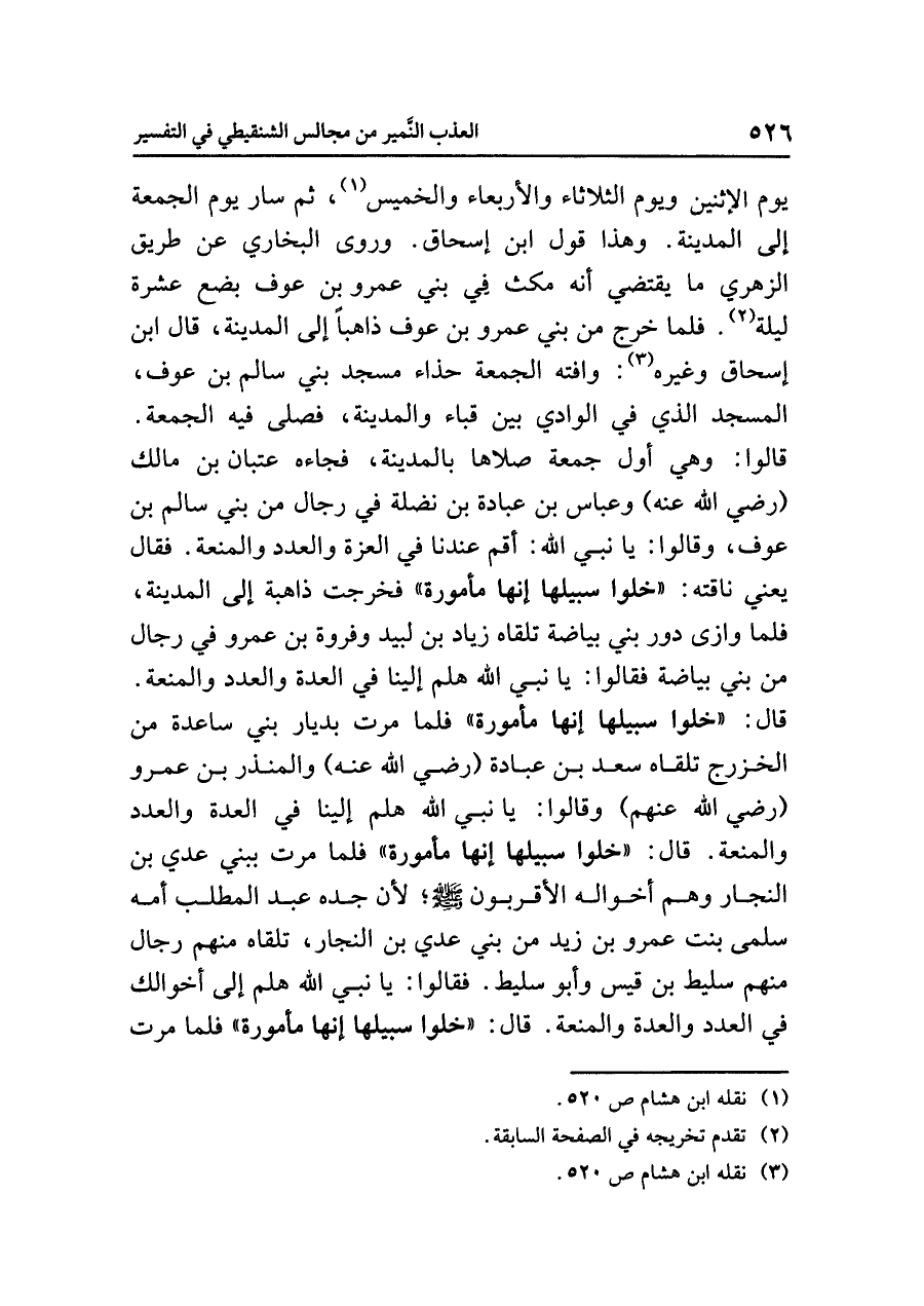 يومَ الإثنينِ ويومَ الثلاثاءِ والأربعاءَ والخميسَ (¬١)، ثم سار يومَ الجمعةِ إلى المدينةِ. وهذا قولُ ابنِ إسحاقَ. وروى البخاريُّ عن طريقِ الزهريِّ ما يقتضي أنه مَكَثَ في بَنِي عمرِو بنِ عوفٍ بضعَ عشرةَ ليلةً (¬٢). فَلَمَّا خَرَجَ من بَنِي عمرِو بنِ عوفٍ ذاهبًا إلى المدينةِ، قال ابنُ إسحاقَ وغيرُه (¬٣): وَافَتْهُ الجمعةُ حذاءَ مسجدِ بَنِي سالمِ بنِ عوفٍ، المسجدِ الذي في الوادِي بَيْنَ قباء والمدينة، فَصَلَّى فيه الجمعةَ. قالوا: وهي أولُ جمعةٍ صَلَاّهَا بالمدينةِ، فجاءه عتبانُ بنُ مالكٍ (رضي الله عنه) وعباسُ بنُ عبادةَ بنِ نضلةَ في رجالٍ من بَنِي سالمِ بنِ عوفٍ، وقالوا: يا نَبِيَّ الله: أَقِمْ عندنا في العزةِ والعددِ والمنعةِ. فقال يعني ناقتَه: «خَلُّوا سَبِيلَهَا إِنَّهَا مَأْمُورَةٌ» فخرجت ذاهبةً إلى المدينةِ، فَلَمَّا وَازَى دُورَ بَنِي بياضةَ تَلَقَّاهُ زيادُ بنُ لبيدٍ وفروةُ بنُ عمرٍو في رجالٍ من بَنِي بياضةَ فقالوا: يا نَبِيَّ اللَّهِ هَلُمَّ إلينا في العدةِ والعددِ والمنعةِ. قال: «خَلُّوا سَبِيلَهَا إِنَّهَا مَأْمُورَةٌ» فلما مَرَّتْ