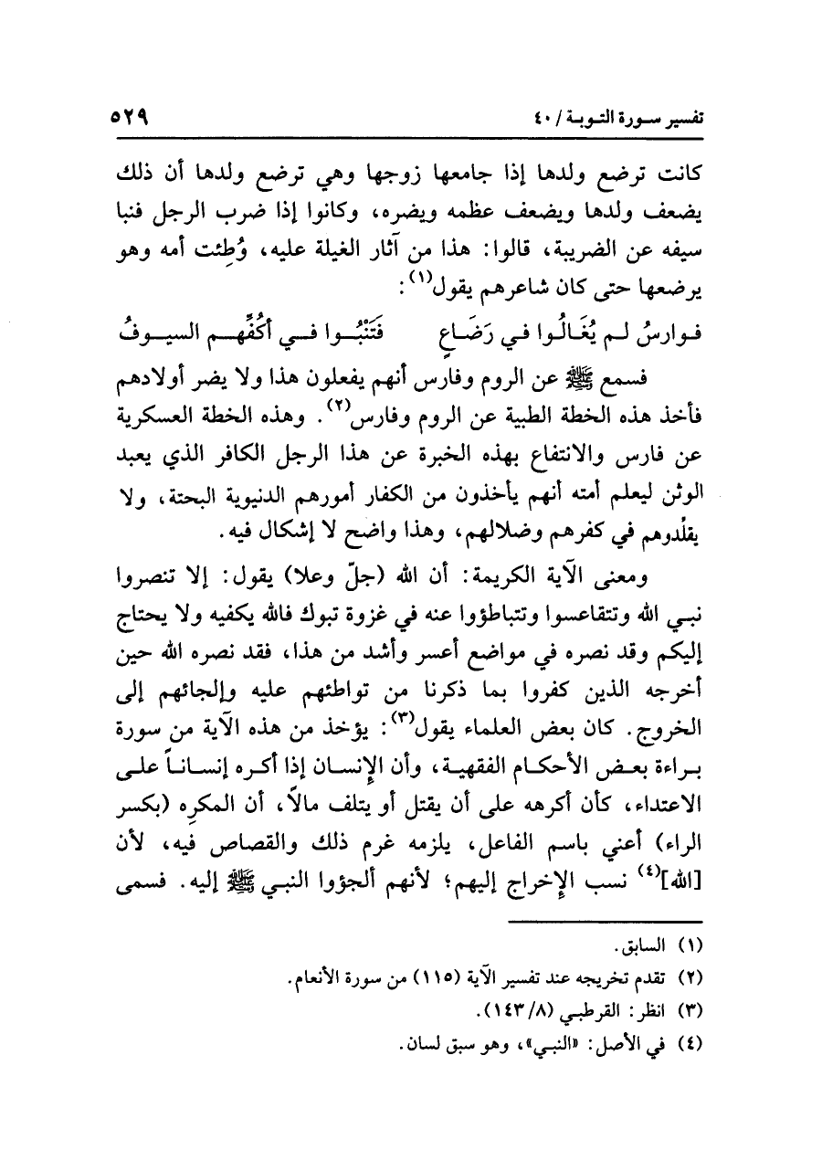 ومعنَى الآيةِ الكريمةِ: أن اللَّهَ (جل وعلا) يقولُ: إلا تَنْصُرُوا نَبِيَّ اللَّهِ وتتقاعسوا وتتباطؤوا عنه في غزوةِ تبوكَ فالله يَكْفِيهِ ولا يحتاجُ إليكم وقد نَصَرَهُ في مواضعَ أعسرَ وأشدَّ من هذا، فقد نَصَرَهُ اللَّهُ حين أَخْرَجَهُ الذين كفروا بما ذَكَرْنَا من تواطئِهم عليه وإلجائِهم إلى الخروجِ. كان بعضُ العلماءِ يقولُ (¬٣): يُؤْخَذُ من هذه الآيةِ من سورةِ براءة بعضُ الأحكامِ الفقهيةِ، وأن الإنسانَ إذا أَكْرَهَ إنسانًا على الاعتداءِ، كَأَنْ أكرهَه على أن يقتلَ أو يتلفَ مالاً، أن المكرِه (بكسرِ الراءِ) أعنِي باسمِ الفاعلِ، يلزمُه غُرْمُ ذلك والقصاصُ فيه، لأَنَّ [الله] (¬٤) نَسَبَ الإخراجَ إليهم؛ لأنهم أَلْجَؤُوا النبيَّ صلى الله عليه وسلم إليه. فَسَمَّى
