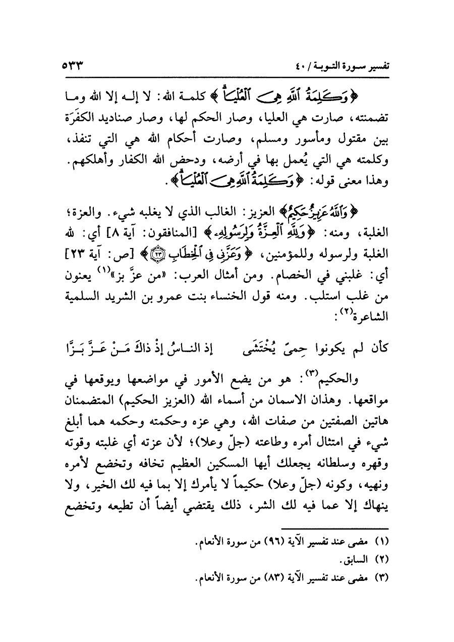 {وَكَلِمَةُ اللَّهِ هِيَ الْعُلْيَا} كلمةُ اللَّهِ: لَا إِلَهَ إِلَاّ اللَّهُ وما تَضَمَّنَتْهُ، صارت هي العليا، وصار الْحُكْمُ لها، وصار صناديدُ الكفَرَةِ بينَ مقتولٍ ومأسورٍ وَمُسْلِمٍ، وصارت أحكامُ اللَّهِ هي التي تَنْفُذُ، وكلمتُه هي التي يُعْمَلُ بها في أرضِه، ودحض اللَّهُ الكفارَ وأهلَكهم. وهذا معنَى قولِه: {وَكَلِمَةُ اللَّهِ هِيَ الْعُلْيَا}.