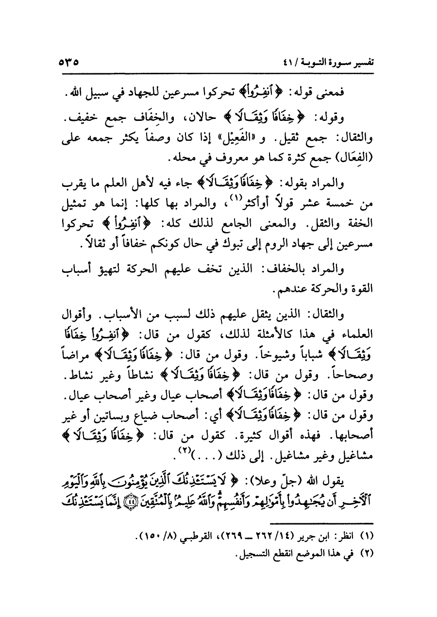 والمرادُ بقولِه: {خِفَافًا وَثِقَالاً} جاء فيه لأهلِ العلمِ ما يقرُب من خمسةَ عشرَ قولاً أو أكثرَ (¬١)، والمرادُ بها كُلِّهَا: إنما هو تمثيلُ الخفةِ والثقلِ. والمعنَى الجامعُ لذلك كلِّه: {انْفِرُوا} تَحَرَّكُوا مسرعينَ إلى جهادِ الرومِ إلى تبوكَ في حالِ كونِكم خفافًا أو ثقالاً.