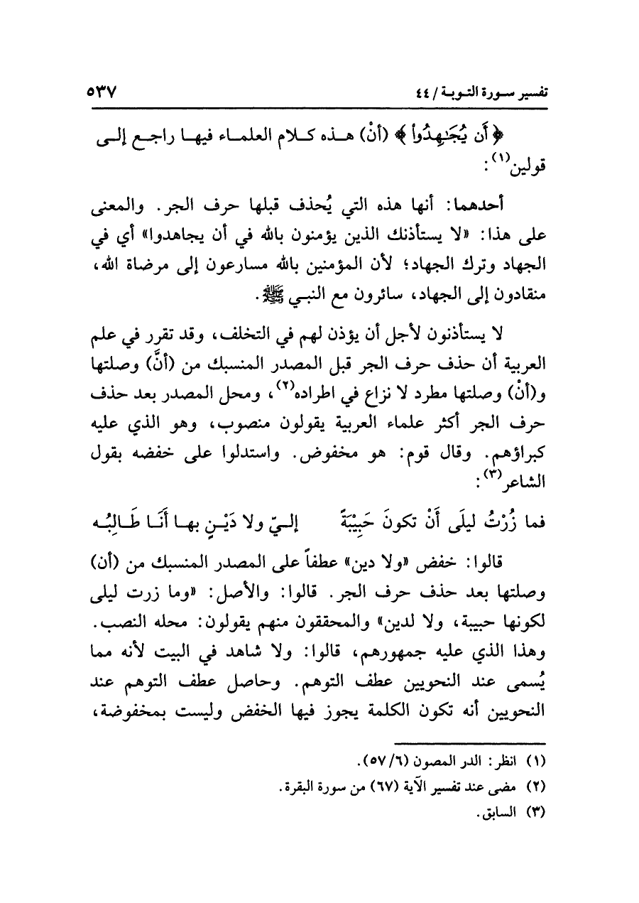 لَا يستأذنونَ لأَجْلِ أن يُؤْذَنَ لهم في التخلفِ، وقد تقررَ في علمِ العربيةِ أن حذفَ حرفِ الجرِّ قبلَ المصدرِ المنسبكِ من (أنَّ) وصلتِها و (أنْ) وصلتِها مطردٌ لا نزاعَ في اطرادِه (¬٢)، ومحلُّ المصدرِ بعدَ حذفِ حرفِ الجرِّ أَكْثَرُ علماءِ العربيةِ يقولونَ منصوبٌ، وهو الذي عليه كبراؤهم. وقال قومٌ: هو مخفوضٌ. واستدلوا على خفضِه بقولِ الشاعرِ (¬٣):