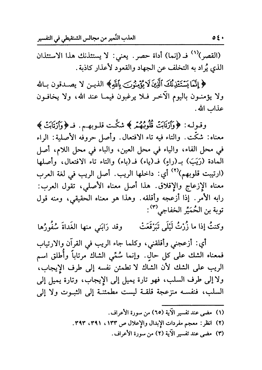 وقولُه: {وَارْتَابَتْ قُلُوبُهُمْ} شَكَّتْ قلوبُهم. فـ {وَارْتَابَتْ} معناه: شَكَّتْ. والتاءُ فيه تاءُ الافتعالِ. وأصلُ حروفِه الأصليةِ: الراءُ في محلِّ الفاءِ، والياءُ في مَحَلِّ العينِ، والباءُ في محلِّ اللامِ، أصلُ المادةِ (رَيَبَ) بـ (راءٍ) فـ (ياء) فـ (باء) والتاءُ تاءُ الافتعالِ، وأصلُها (وَارْتِيبَتْ قلوبُهم) (¬٢)