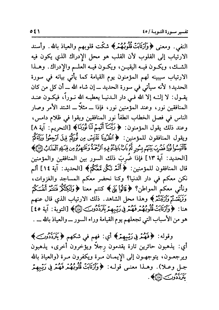 النفيِ. ومعنَى {وَارْتَابَتْ قُلُوبُهُمْ} شَكَّتْ قلوبُهم والعياذُ بِاللَّهِ. وَأَسْنَدَ الارتيابَ إلى القلوبِ لأَنَّ القلبَ هو مَحَلُّ الإدراكِ الذي يكونُ فيه الشكُّ، ويكونُ فيه اليقينُ، ويكونُ فيه العلمُ والإدراكُ. وهذا الارتيابُ سَيُبَيِّنُهُ لهم المؤمنونَ يومَ القيامةِ كما يأتِي بيانُه في سورةِ الحديدِ؛ لأنه سيأتِي في سورةِ الحديدِ - إن شاء الله - أَنَّ كُلَّ مَنْ كان يقولُ: لَا إِلَهَ إِلَاّ اللَّهُ في دارِ الدنيا يُعْطِيهِ اللَّهُ نورًا، فيكونُ عندَ المنافقينَ نُورٌ، وعندَ المؤمنينَ نورٌ، فإذا - مثلاً - اشْتَدَّ الأمرُ وصارَ الناسُ في فصلِ الخطابِ انْطَفَأَ نورُ المنافقينَ وَبَقُوا في ظلامٍ دامسٍ، وعند ذلك يقولُ المؤمنونَ: {رَبَّنَا أَتْمِمْ لَنَا نُورَنَا} [التحريم: آية ٨] ويقولُ المنافقونَ للمؤمنينَ: {انْظُرُونَا نَقْتَبِسْ مِن نُّورِكُمْ قِيلَ ارْجِعُوا وَرَاءَكُمْ فَالْتَمِسُوا نُورًا فَضُرِبَ بَيْنَهُم بِسُورٍ لَّهُ بَابٌ بَاطِنُهُ فِيهِ الرَّحْمَةُ وَظَاهِرُهُ مِنْ قِبَلِهِ الْعَذَابُ} [الحديد: آية ١٣] فإذا ضُرِبَ ذلك السورُ بَيْنَ المنافقينَ والمؤمنينَ قال المنافقونَ للمؤمنينَ: {أَلَمْ نَكُن مَّعَكُمْ} [الحديد: آية ١٤] أَلَمْ نكن معكم في دارِ الدنيا؟ وكنا نحضرُ معكم المساجدَ والغزواتِ، ونأتِي معكم المواطنَ؟ {قَالُوا بَلَى} كنتُم معنا {وَلَكِنَّكُمْ فَتَنتُمْ أَنْفُسَكُمْ وَتَرَبَّصْتُمْ وَارْتَبْتُمْ} وهذا محلُّ الشاهدِ. ذلك الارتيابُ الذي قال عنهم هنا: {وَارْتَابَتْ قُلُوبُهُمْ فَهُمْ فِي رَيْبِهِمْ يَتَرَدَّدُونَ} [التوبة: آية ٤٥] هو من الأسبابِ التي تجعلُهم يومَ القيامةِ وراءَ السورِ، والعياذُ بالله.