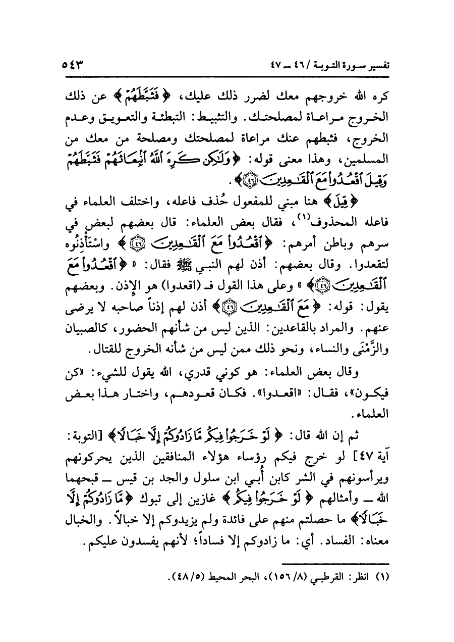 {قِيلَ} هنا مَبْنِيٌّ للمفعولِ حُذِفَ فاعلُه، واختلفَ العلماءُ في فاعلِه المحذوفِ (¬١)، فقال بعضُ العلماءِ: قال بعضُهم لبعضٍ في سِرِّهِمْ وباطنِ أمرِهم: {اقْعُدُوا مَعَ الْقَاعِدِينَ} وَاسْتَأْذِنُوهُ لتقعدوا. وقال بعضُهم: أَذِنَ لهم النبيُّ صلى الله عليه وسلم فقال: {اقْعُدُوا مَعَ الْقَاعِدِينَ} وعلى هذا القولِ فـ (اقعدوا) هو الإذنُ. وبعضُهم يقول: قولُه: {مَعَ الْقَاعِدِينَ} أَذِنَ لهم إِذْنًا صاحبُه لَا يرضى عنهم. والمرادُ بالقاعدينَ: الذين ليس من شأنِهم الحضورُ، كالصبيانِ والزَّمْنَى والنساءِ، ونحو ذلك ممن ليس من شأنِه الخروجُ للقتالِ.