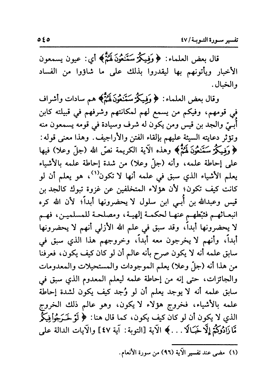 وقال بعضُ العلماءِ: {وَفِيكُمْ سَمَّاعُونَ لَهُمْ} هم ساداتٌ وأشرافٌ في قومِهم، وفيكم مَنْ يسمعُ لهم لمكانتِهم وشرفِهم في قبيلتِه كابنِ أُبَيٍّ والجدِّ بنِ قيسٍ وَمَنْ يكونُ له شرفٌ وسيادةٌ في قومِه يسمعونَ منه وَتُؤَثِّرُ دعايتُه السيئةُ عليهم بإلقاءِ الفتنِ والأراجيفِ. وهذا معنى قولِه: {وَفِيكُمْ سَمَّاعُونَ لَهُمْ} وهذه الآيةُ الكريمةُ نَصَّ اللَّهُ (جلَّ وعلا) فيها على إحاطةِ عِلْمِهِ، وأنه (جلَّ وعلا) من شدةِ إحاطةِ علمِه بالأشياءِ يعلمُ الأشياءَ الذي سَبَقَ في علمِه أنها لا تكونُ (¬١)،