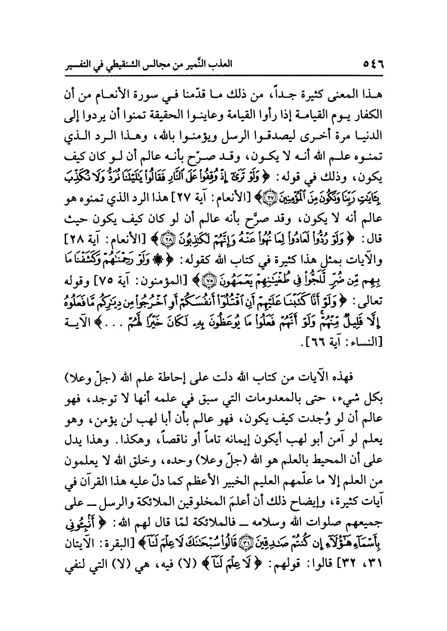 فهذه الآياتُ من كتابِ اللَّهِ دَلَّتْ على إحاطةِ عِلْمِ اللَّهِ (جلَّ وعلا) بِكُلِّ شيءٍ، حتى بالمعدوماتِ التي سَبَقَ في علمِه أنها لا توجدُ، فهو عَالِمٌ أن لو وُجِدَتْ كيف يكونُ، فهو عَالِمٌ بأن أبا لهب لن يُؤْمِنَ، وهو يعلمُ لو آمَنَ أبو لهبٍ أيكونُ إيمانُه تَامًّا أو نَاقِصًا، وهكذا. وهذا يدلُّ على أن المحيطَ بالعلمِ هو اللَّهُ (جلَّ وعلا) وحدَه، وَخَلْقُ اللَّهِ لا يعلمونَ من العلمِ إلا ما علَّمهم العليمُ الخبيرُ الأعظمُ كما دَلَّ عليه هذا القرآنُ في آياتٍ كثيرةٍ، وإيضاحُ ذلك أن أَعْلَمَ المخلوقينَ الملائكةُ والرسلُ - على جميعِهم صلواتُ اللَّهِ وسلامُه - فالملائكةُ لَمَّا قال لهم اللَّهُ: {فَقَالَ أَنْبِئُونِي بِأَسْمَاءِ هَؤُلَاءِ إِنْ كُنْتُمْ صَادِقِينَ (٣١) قَالُوا سُبْحَانَكَ لَا عِلْمَ لَنَا} [البقرة: الآيتان ٣١، ٣٢] قولُهم: {لَا عِلْمَ لَنَا} (لا) فيه، هي (لا) التي لنفيِ