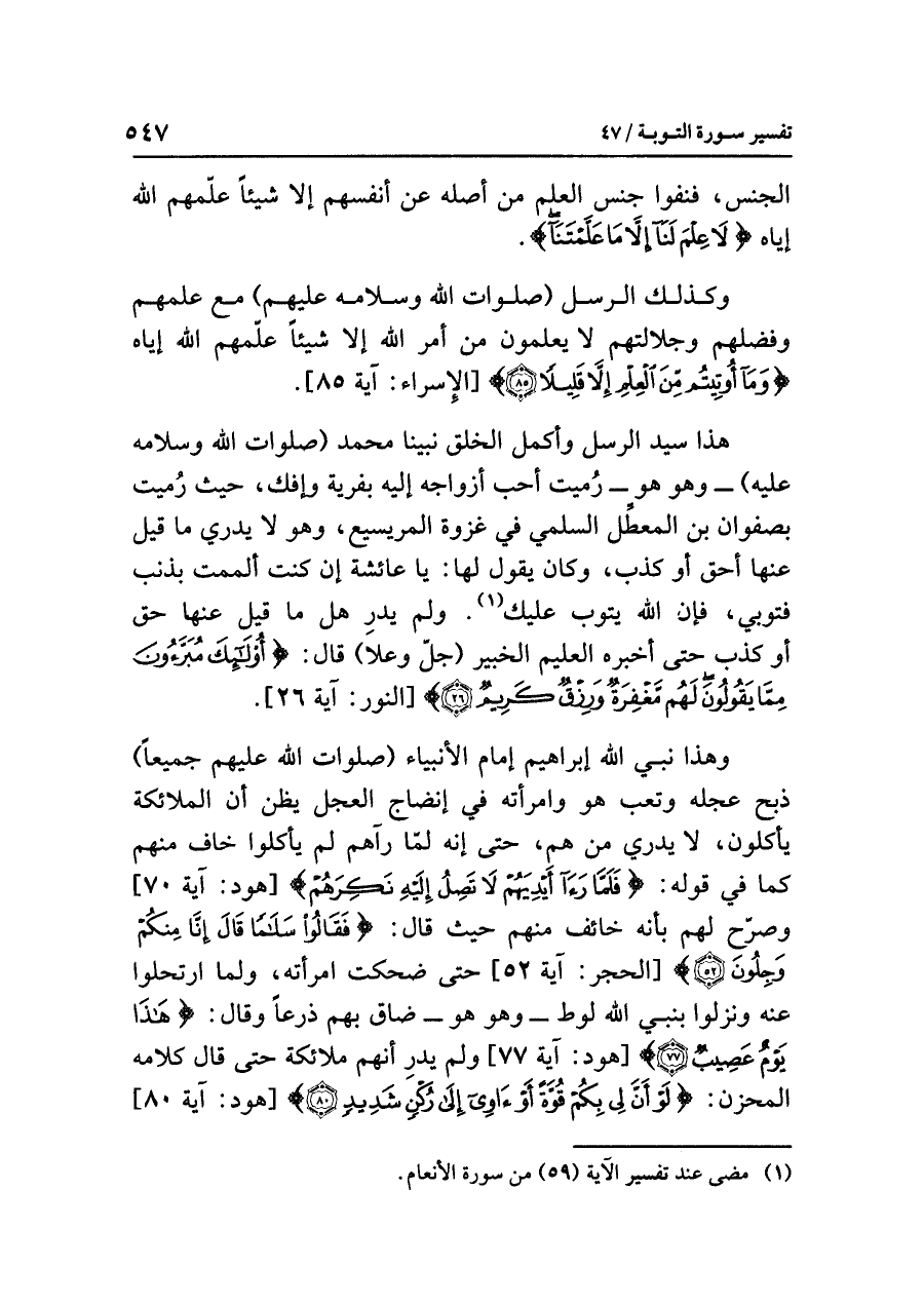 وهذا نَبِيُّ اللَّهِ إبراهيمُ إمامُ الأنبياءِ (صلواتُ اللَّهِ عليهم جميعًا) ذَبَحَ عِجْلَهُ وتعب هو وامرأتُه في إنضاجِ العجلِ يَظُنُّ أن الملائكةَ يأكلون، لا يدرِي مَنْ هُمْ، حتى إنه لَمَّا رآهم لم يأكلوا خَافَ منهم كما في قولِه: {فَلَمَّا رَأَى أَيْدِيَهُمْ لَا تَصِلُ إِلَيْهِ نَكِرَهُمْ} [هود: آية ٧٠] وَصَرَّحَ لهم بأنه خائفٌ منهم حيث قال: {فَقَالُوا سَلامًا قَالَ إِنَّا مِنْكُمْ وَجِلُونَ} [الحجر: آية ٥٢] حتى ضَحِكَتِ امرأتُه، وَلَمَّا ارتحلوا عنه ونزلوا بنبيِّ اللَّهِ لوطٍ - وهو هو - ضَاقَ بهم ذَرْعًا وقال: {هَذَا يَوْمٌ عَصِيبٌ} [هود: آية ٧٧] وَلَمْ يَدْرِ أنهم ملائكةٌ حتى قال كلامَه المحزنَ: {لَوْ أَنَّ لِي بِكُمْ قُوَّةً أَوْ آوِي إِلَى رُكْنٍ شَدِيدٍ} [هود: آية ٨٠]