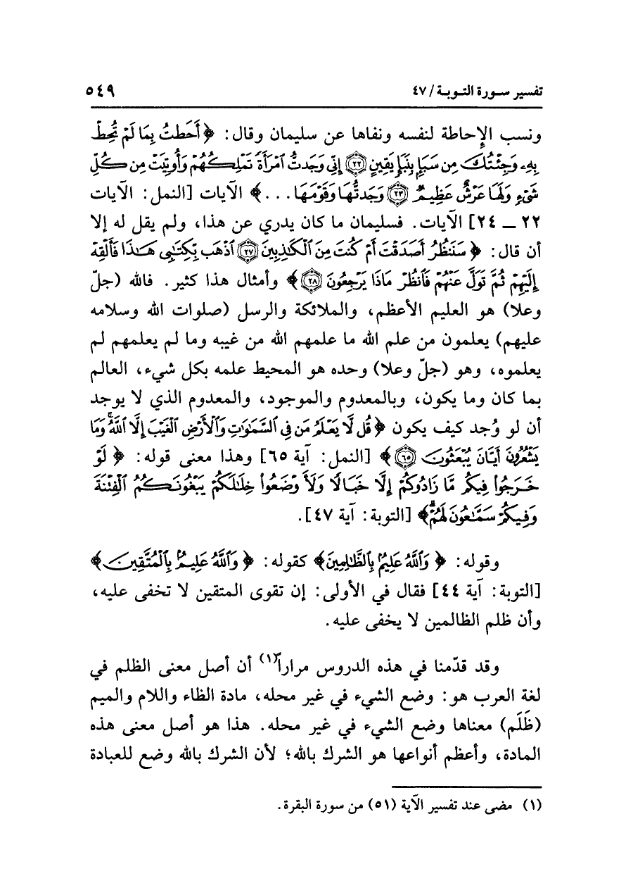وَنَسَبَ الإحاطةَ لنفسِه ونفاها عن سليمانَ وقال: {أَحَطْتُ بِمَا لَمْ تُحِطْ بِهِ وَجِئْتُكَ مِنْ سَبَإٍ بِنَبَإٍ يَقِينٍ (٢٢) إِنِّي وَجَدتُّ امْرَأَةً تَمْلِكُهُمْ وَأُوتِيَتْ مِنْ كُلِّ شَيْءٍ وَلَهَا عَرْشٌ عَظِيمٌ (٢٣) وَجَدتُّهَا وَقَوْمَهَا} الآياتِ [النمل: الآيات ٢٢ - ٢٤]. فسليمانُ ما كان يدرِي عن هذا، ولم يَقُلْ له إلا أن قال: {سَنَنْظُرُ أَصَدَقْتَ أَمْ كُنْتَ مِنَ الْكَاذِبِينَ اذْهَب بِّكِتَابِي هَذَا فَأَلْقِهْ إِلَيْهِمْ ثُمَّ تَوَلَّ عَنْهُمْ فَانْظُرْ مَاذَا يَرْجِعُونَ (٢٨)} وأمثالُ هذا كثيرٌ.