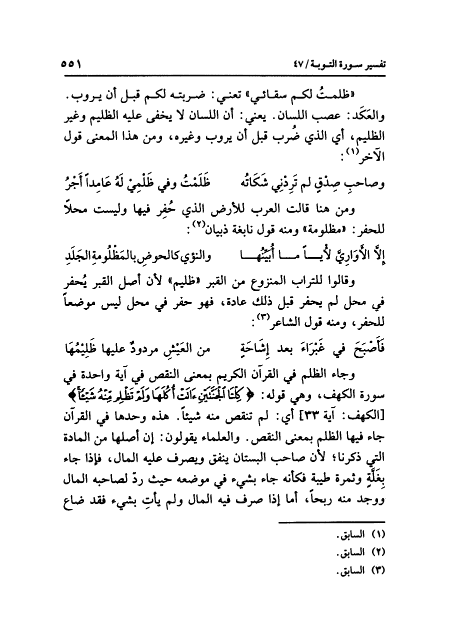 وجاء الظلمُ في القرآنِ الكريمِ بمعنَى النقصِ في آيةٍ واحدةٍ في سورةِ الكهفِ، وهي قولُه: {كِلْتَا الْجَنَّتَيْنِ آتَتْ أُكُلَهَا وَلَمْ تَظْلِمْ مِنْهُ شَيْئًا} [الكهف: آية ٣٣] أي: لم تَنْقُصْ منه شيئًا. هذه وحدَها في القرآنِ جاء فيها الظلمُ بمعنَى النقصِ. والعلماءُ يقولونَ: إن أصلَها من المادةِ التي ذَكَرْنَا؛ لأن صاحبَ البستانِ ينفقُ ويصرفُ عليه المالَ، فإذا جاء بِغَلَّةٍ وثمرةٍ طيبةٍ فكأنه جاء بشيءٍ في موضعِه حيث رَدَّ لصاحبِه المالَ ووجدَ منه رِبْحًا، أما إذا صَرَفَ فيه المالَ ولم يَأْتِ بشيءٍ فقد ضَاعَ