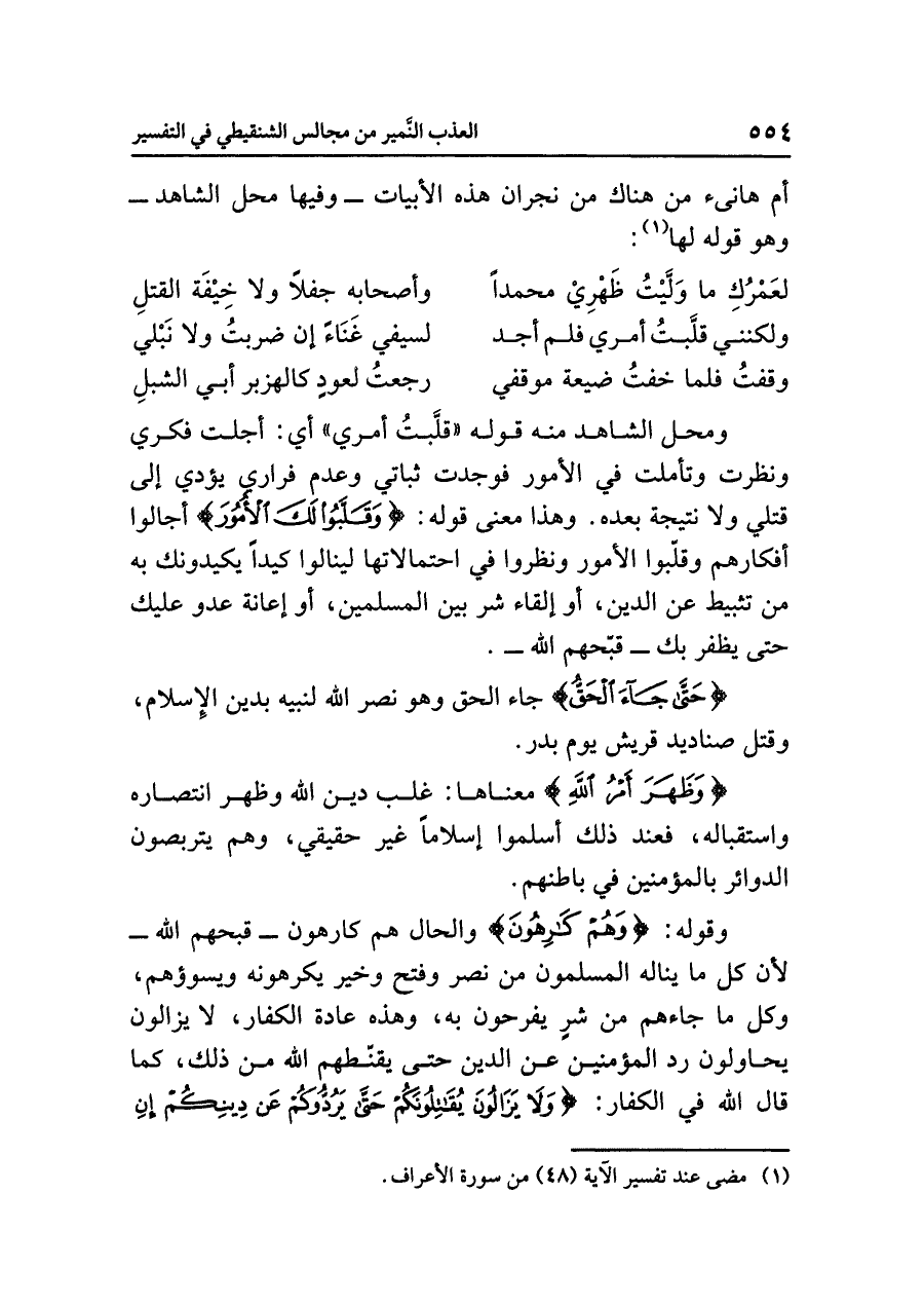 ومحلُّ الشاهدِ منه قولُه «قلَّبتُ أمري» أي: أَجَلْتُ فكري ونظرتُ وتأملتُ في الأمورِ فوجدتُ ثباتِي وعدمَ فرارِي يؤدِي إلى قتلي ولا نتيجةَ بعدَه. وهذا معنَى قولِه: {وَقَلَّبُوا لَكَ الأُمُورَ} أي: أَجَالُوا أفكارَهم وَقَلَّبُوا الأمورَ ونظروا في احتمالاتِها لينالوا كيدًا يكيدونَك به من تثبيطٍ عن الدينِ، أو إلقاءِ شَرٍّ بينَ المسلمينَ، أو إعانة عدوٍّ عليكَ حتى يظفرَ بكَ، قبَّحهم اللَّهُ.