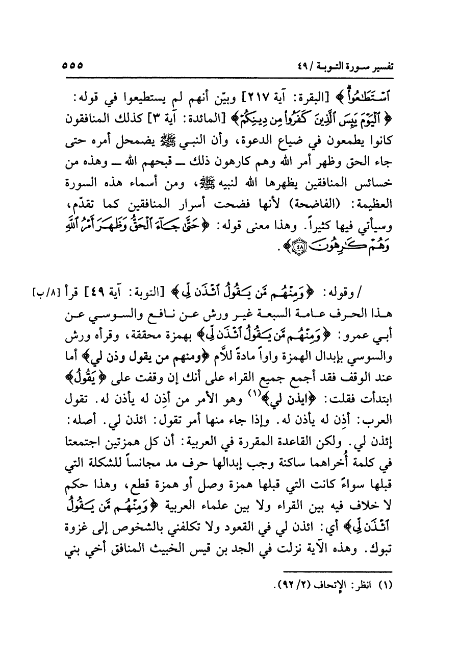 [٨/ب] / وقوله: {وَمِنْهُم مَّنْ يَقُولُ ائْذَن لِّي} [التوبة: آية ٤٩] قَرَأَ هذا الحرفَ عامةُ السبعةِ غيرَ ورشٍ عن نافعٍ والسوسيِّ عن أَبِي عمرٍو: {وَمِنْهُم مَّنْ يَقُولُ ائْذَن لِّي} بهمزةٍ مُحَقَّقَةٍ، وقرأه ورشٌ والسوسيُّ بإبدالِ الهمزةِ واوًا مادةً للَاّمِ {ومنهم من يقول وذن لي} أما عندَ الوقفِ فقد أَجْمَعَ جميعُ القراءِ على أنك إن وقفتَ على {يَقُولُ} ابتدأتَ فقلتَ: (ايذن لي} (¬١) وهو الأمرُ مِنْ أَذِنَ له يأذنُ له. تقولُ العربُ: أذِن له يأذنُ له. وإذا جاء منها أَمْرٌ تقول: ائْذَنْ لِي. أصلُه: إئذن لي. ولكن القاعدةَ المقررةَ في العربيةِ: أن كُلَّ همزتين اجْتَمَعَتَا في كلمةٍ أُخْرَاهُمَا ساكنةٌ وَجَبَ إبدالُها حرفَ مَدٍّ مُجَانِسًا للشكلةِ التي قبلَها سواءً أكانت التي قبلَها همزةَ وصلٍ أو همزةَ قَطْعٍ، وهذا حكمٌ لا خِلَافَ فيه بَيْنَ القراءِ ولَا بَيْنَ علماءِ العربيةِ {وَمِنْهُم مَّنْ يَقُولُ ائْذَن لِّي} أي: ائْذَنْ لي في القعودِ ولا تُكَلِّفْنِي بالشخوصِ إلى غزوةِ تبوكَ. وهذه الآيةُ نَزَلَتْ في الجدِّ بنِ قيسٍ الخبيثِ المنافقِ أخِي بَنِي