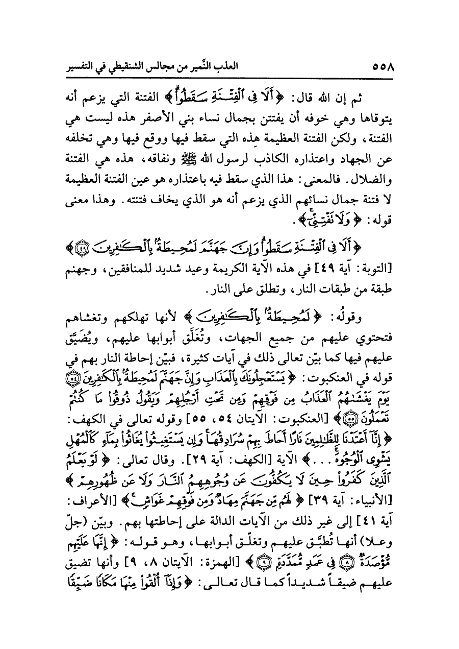 {أَلَا فِي الْفِتْنَةِ سَقَطُوا وَإِنَّ جَهَنَّمَ لَمُحِيطَةٌ بِالْكَافِرِينَ} [التوبة: آية ٤٩] في هذه الآيةِ الكريمةِ وعيدٌ شديدٌ للمنافقين، وجهنمُ طبقةٌ من طبقاتِ النارِ، وَتُطْلَقُ على النارِ.