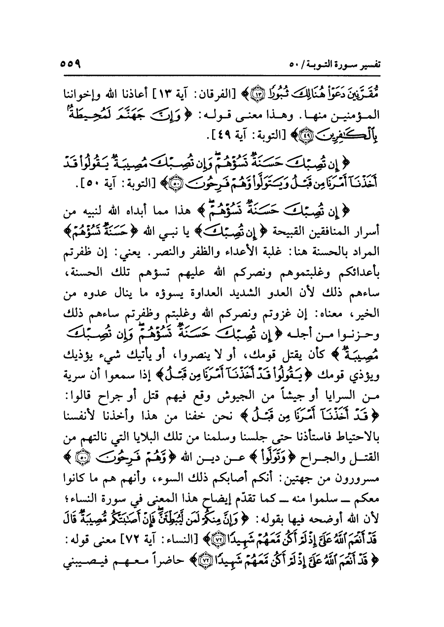 {إِنْ تُصِبْكَ حَسَنَةٌ تَسُؤْهُمْ} هذا مِمَّا أبداه اللَّهُ لِنَبِيِّهِ من أسرارِ المنافقينَ القبيحةِ {إِنْ تُصِبْكَ} يا نَبِيَّ اللَّهِ {حَسَنَةٌ تَسُؤْهُمْ} المرادُ بالحسنةِ هنا: غلبةُ الأعداءِ والظفرُ والنصرُ. يعني: إن ظَفِرْتُمْ بأعدائِكم وغلبتموهم وَنَصَرَكُمُ اللَّهُ عليهم تسؤهم تلك الحسنةُ، ساءهم ذلك لأن العدوَّ الشديدَ العداوةِ يسوؤه ما ينال عدوَّه من الخيرِ، معناه: إن غَزَوْتُمْ وَنَصَرَكُمُ اللَّهُ وغلبتُم وظفرتُم ساءهم ذلك وحزنوا من أجلِه {إِنْ تُصِبْكَ حَسَنَةٌ تَسُؤْهُمْ وَإِنْ تُصِبْكَ مُصِيبَةٌ} كأن يُقْتَلَ قومُك، أو لا يُنْصَرُوا، أو يأتيَك شيءٌ يؤذيك ويؤذي قومَك {يَقُولُوا قَدْ أَخَذْنَا أَمْرَنَا مِنْ قَبْلُ} إذا سَمِعُوا أن سريةً من السرايا أو جيشًا من الجيوشِ وَقَعَ فيهم قتلٌ أو جِرَاحٌ قالوا: {قَدْ أَخَذْنَا أَمْرَنَا مِنْ قَبْلُ} نحن خِفْنَا من هذا وَأَخَذْنَا لأنفسِنا بالاحتياطِ فَاسْتَأْذَنَّا حتى جَلَسْنَا وَسَلِمْنَا من تلك البلايا التي نالتهم من القتلِ والجراحِ {وَتَوَلَّوا} عن دينِ اللَّهِ {وَّهُمْ فَرِحُونَ} مسرورونَ من جهتينِ: أنكم أصابكم ذلك السوءُ، وأنهم هم ما كانوا معكم - سَلِمُوا منه - كما تقدَّم إيضاحُ هذا المعنَى في سورةِ النساءِ؛ لأن اللَّهَ أَوْضَحَهُ فيها بقولِه: {وَإِنَّ مِنْكُمْ لَمَن لَّيُبَطِّئَنَّ فَإِنْ أَصَابَتْكُم مُّصِيبَةٌ قَالَ قَدْ أَنْعَمَ اللَّهُ عَلَيَّ إِذْ لَمْ أَكُن مَّعَهُمْ شَهِيدًا (٧٢)} [النساء: آية ٧٢] معنى قولِه: {قَدْ أَنْعَمَ اللَّهُ عَلَيَّ إِذْ لَمْ أَكُن مَّعَهُمْ شَهِيدًا} حاضرًا معهم فيصيبَني