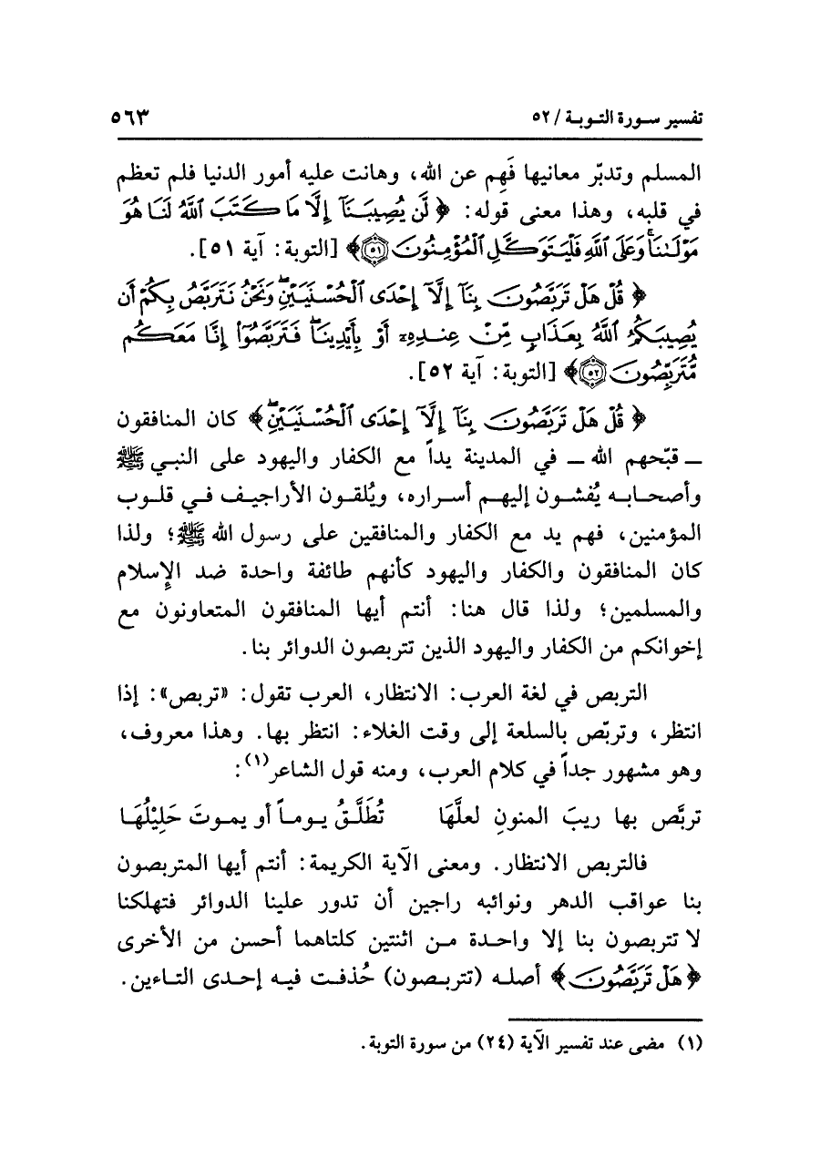 {قُلْ هَلْ تَرَبَّصُونَ بِنَا إِلَاّ إِحْدَى الْحُسْنَيَيْنِ} كان المنافقونَ - قَبَّحَهُمُ اللَّهُ - في المدينةِ يَدًا مع الكفارِ واليهودِ على النَّبِيِّ صلى الله عليه وسلم وأصحابِه يُفْشُونَ إليهم أسرارَه، وَيُلْقُونَ الأراجيفَ في قلوبِ المؤمنينَ، فهم يدٌ مع الكفارِ والمنافقينَ على رسولِ اللَّهِ صلى الله عليه وسلم؛ وَلِذَا كان المنافقونَ والكفارُ واليهودُ كأنهم طائفةٌ واحدةٌ ضِدَّ الإسلامِ والمسلمينَ؛ ولذا قال هنا: أنتم أيها المنافقونَ المتعاونونَ مع إخوانِكم من الكفارِ واليهودِ الذين تتربصونَ الدوائرَ بنا.