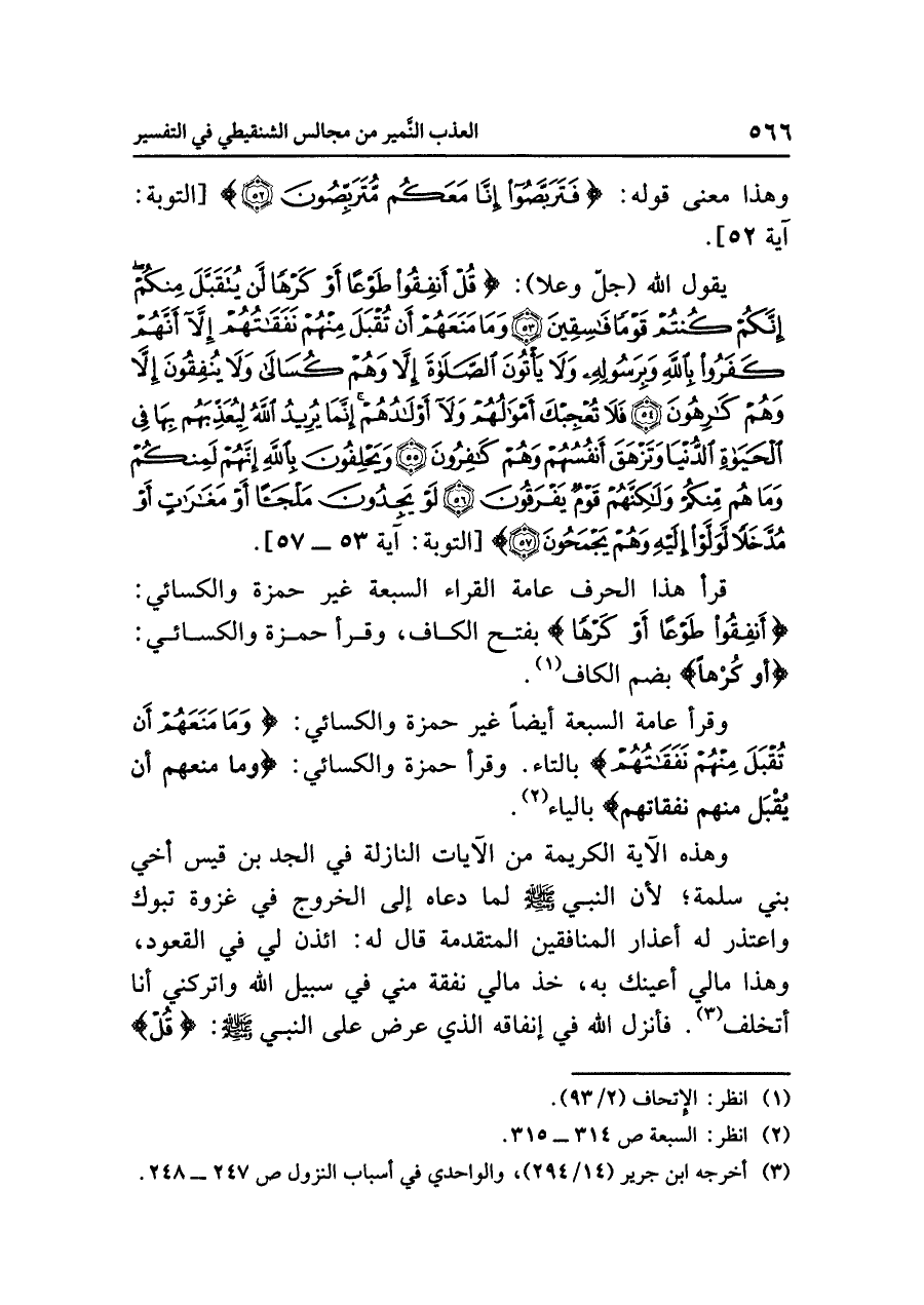 وهذه الآيةُ الكريمةُ من الآياتِ النازلةِ في الجَدِّ بنِ قيسٍ أَخِي بَنِي سلمةَ؛ لأَنَّ النبيَّ صلى الله عليه وسلم لَمَّا دَعَاهُ إلى الخروجِ في غزوةِ تبوكَ واعتذرَ له أعذارَ المنافقينَ المتقدمةَ قال له: ائْذَنْ لِي في القعودِ، وهذا مَالِي أُعِينُكَ به، خُذْ مَالِي نفقةً مِنِّي في سبيلِ اللَّهِ وَاتْرُكْنِي أنا أَتَخَلَّفْ (¬٣). فأنزلَ اللَّهُ في إنفاقِه الذي عَرَضَ على النبيِّ صلى الله عليه وسلم: {قُلْ}