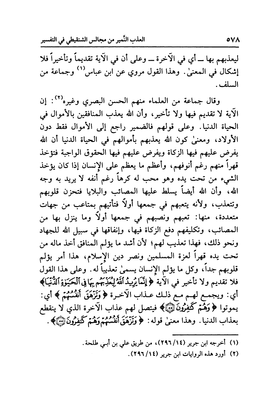 وقال جماعةٌ من العلماءِ منهم الحسنُ البصريُّ وغيرُه (¬٢): إن الآيةَ لَا تقديمَ فيها ولَا تأخيرَ، وأن اللَّهَ يعذبُ المنافقينَ بالأموالِ في الحياةِ الدنيا. وعلى قولِهم فالضميرُ راجعٌ إلى الأموالِ فقط دونَ الأولادِ، ومعنَى كونِ اللَّهِ يعذبُهم بأموالِهم في الحياةِ الدنيا أن اللَّهَ يفرضُ عليهم فيها الزكاةَ ويفرضُ عليهم فيها الحقوقَ الواجبةَ فَتُؤْخَذُ قَهْرًا منهم رغم أنوفِهم، وأعظمُ ما يعظم على الإنسان إذا كان يُؤْخَذُ الشيءُ من تحتِ يدِه وهو مُحِبٌّ له كُرْهًا رغم أنفِه لا يريدُ به وجهَ اللَّهِ، وأن اللَّهَ أيضًا يسلطُ عليها المصائبَ والبلايا فتحزنُ قلوبُهم وتتعذبُ، ولأنه يُتْعِبُهُمْ في جَمْعِهَا أَوَّلاً فتأتيهم بمتاعبَ من جهاتٍ متعددةٍ، منها: تَعَبُهُمْ ونصبُهم في جَمْعِهَا أولاً وما ينزلُ بها مِنَ المصائبِ، وتكليفُهم دفعَ الزكاةِ فيها، وإنفاقُها في سبيلِ اللَّهِ للجهادِ ونحو ذلك، فهذا تعذيبٌ لهم؛ لأن أَشَدَّ ما يُؤْلِمُ المنافقَ أخذُ مالِه من تحتِ يدِه قَهْرًا لِعِزَّةِ المسلمينَ ونصرِ دينِ الإسلامِ، هذا أمرٌ يُؤْلِمُ قلوبَهم جِدًّا، وَكُلُّ ما يُؤْلِمُ الإنسانَ يُسَمَّى تعذيبًا له. وعلى هذا القولِ فلَا تقديمَ ولا تأخيرَ في الآيةِ {إِنَّمَا يُرِيدُ اللَّهُ لِيُعَذِّبَهُم بِهَا فِي الْحَيَاةِ الدُّنْيَا} أي: ويجمعَ لهم مع ذلك عذابَ الآخرةِ {وَتَزْهَقَ أَنفُسُهُمْ} أي: يموتوا {وَهُمْ كَافِرُونَ} فيتصلُ لَهُمْ عذابُ الآخرةِ الذي لَا ينقطعُ بعذابِ الدنيا. وهذا معنَى قولِه: {وَتَزْهَقَ أَنْفُسُهُمْ وَهُمْ كَافِرُونَ}.