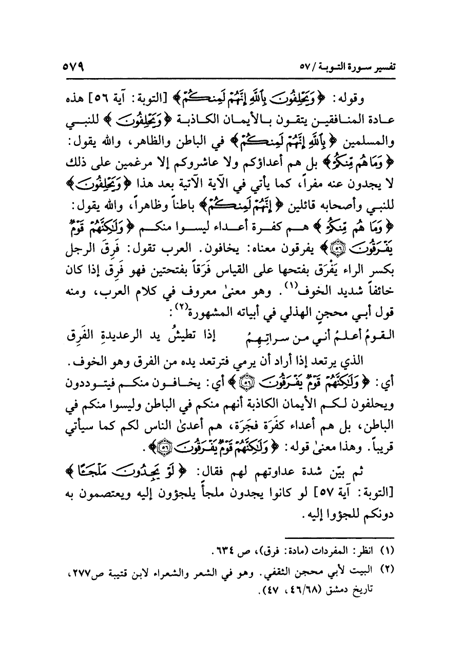 وقولُه: {وَيَحْلِفُونَ بِاللَّهِ إِنَّهُمْ لَمِنْكُمْ} [التوبة: آية ٥٦] هذه عادةُ المنافقينَ يتقونَ بِالأَيْمَانِ الكاذبةِ {وَيَحْلِفُونَ} للنبيِّ والمسلمينَ {بِاللَّهِ إِنَّهُمْ لَمِنْكُمْ} في الباطنِ والظاهرِ، وَاللَّهُ يقولُ: {وَمَا هُم مِّنْكُمْ} بل هم أعداؤُكم ولا عَاشَرُوكُمْ إلا مُرْغَمِينَ على ذلك لَا يجدونَ عنه مَفَرًّا، كما يأتِي في الآيةِ الآتيةِ بعدَ هذا {وَيَحْلِفُونَ} للنبيِّ وأصحابِه قائلينَ {إِنَّهُمْ لَمِنْكُمْ} بَاطِنًا وَظَاهِرًا، وَاللَّهُ يقولُ: {وَمَا هُم مِّنْكُمْ} هم كفرةٌ أعداءُ ليسوا منكم {وَلَكِنَّهُمْ قَوْمٌ يَفْرَقُونَ} يَفْرَقُونَ معناه: يَخَافُونَ. العربُ تقولُ: فَرِقَ الرجلُ بكسرِ الراءِ يَفْرَقُ بفتحِها على القياسِ فَرَقًا بفتحتينِ فهو فَرِقَ إذا كان خَائِفًا شديدَ الخوفِ (¬١). وهو معنًى معروفٌ في كلامِ العربِ، ومنه قولُ أبِي مِحْجَنٍ الهذليِّ في أبياتِه المشهورةِ (¬٢):