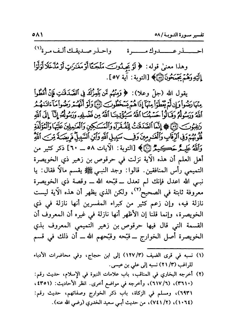 يقولُ اللَّهُ (جلَّ وعلا): {وَمِنْهُم مَّنْ يَلْمِزُكَ فِي الصَّدَقَاتِ فَإِنْ أُعْطُوا مِنْهَا رَضُوا وَإِن لَّمْ يُعْطَوْا مِنْهَا إِذَا هُمْ يَسْخَطُونَ (٥٨) وَلَوْ أَنَّهُمْ رَضُوْا مَا آتَاهُمُ اللَّهُ وَرَسُولُهُ وَقَالُوا حَسْبُنَا اللَّهُ سَيُؤْتِينَا اللَّهُ مِنْ فَضْلِهِ وَرَسُولُهُ إِنَّا إِلَى اللَّهِ رَاغِبُونَ (٥٩) إِنَّمَا الصَّدَقَاتُ لِلْفُقَرَاءِ وَالْمَسَاكِينِ وَالْعَامِلِينَ عَلَيْهَا وَالْمُؤَلَّفَةِ قُلُوبُهُمْ وَفِي الرِّقَابِ وَالْغَارِمِينَ وَفِي سَبِيلِ اللَّهِ وَابْنِ السَّبِيلِ فَرِيضَةً مِّنَ اللَّهِ وَاللَّهُ عَلِيمٌ حَكِيمٌ (٦٠)} [التوبة: الآيات ٥٨ - ٦٠]، ذَكَرَ كثيرٌ من أهلِ العلمِ أن هذه الآيةَ نَزَلَتْ في حرقوصَ بنِ زهيرٍ ذِي الخويصرةِ التميميِّ رأسِ المنافقينَ. قالوا: وَجَدَ النبيَّ صلى الله عليه وسلم يُقَسِّمُ مالاً فقال: يا نَبِيَّ اللَّهِ اعْدِلْ؛ فإنك لَمْ تَعْدِلْ - قَبَّحَهُ اللَّهُ - وَقِصَّةُ ذِي الخويصرةِ معروفةٌ ثابتةٌ في الصحيحِ (¬٢)، ولكن الذي يظهرُ أن هذه الآيةَ ليست نازلةً فيه، وإن زَعَمَ كثيرٌ من كبراءِ المفسرينَ أنها نازلةٌ في ذِي الخويصرةِ، وإنما قُلْنَا إن الأظهرَ أنها نازلةٌ في غيرِه أن المعروفَ أن القسمةَ التي قال فيها حرقوصُ بنُ زهيرٍ التميميُّ المعروفُ بذي الخويصرةِ أصلُ الخوارجِ - قَبَّحَهُ وَقَبَّحَهُمُ اللَّهُ - أن ذلك في قَسْمِ