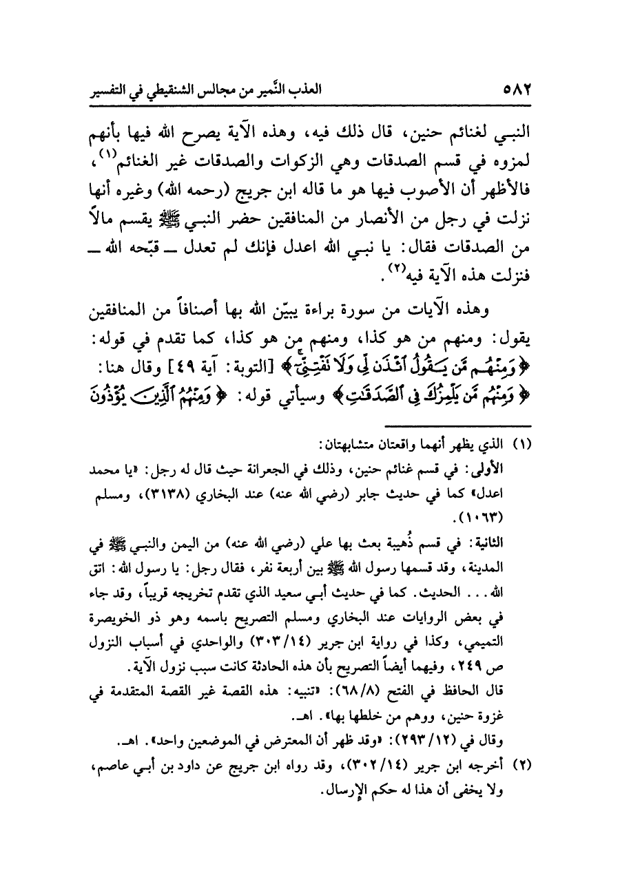 النبيِّ لغنائمِ حنينٍ، قال ذلك فيه، وهذه الآيةُ يُصَرِّحُ اللَّهُ فيها بأنهم لَمَزُوهُ في قسمِ الصدقاتِ وهي الزكواتُ والصدقاتُ غير الغنائم (¬١)،
