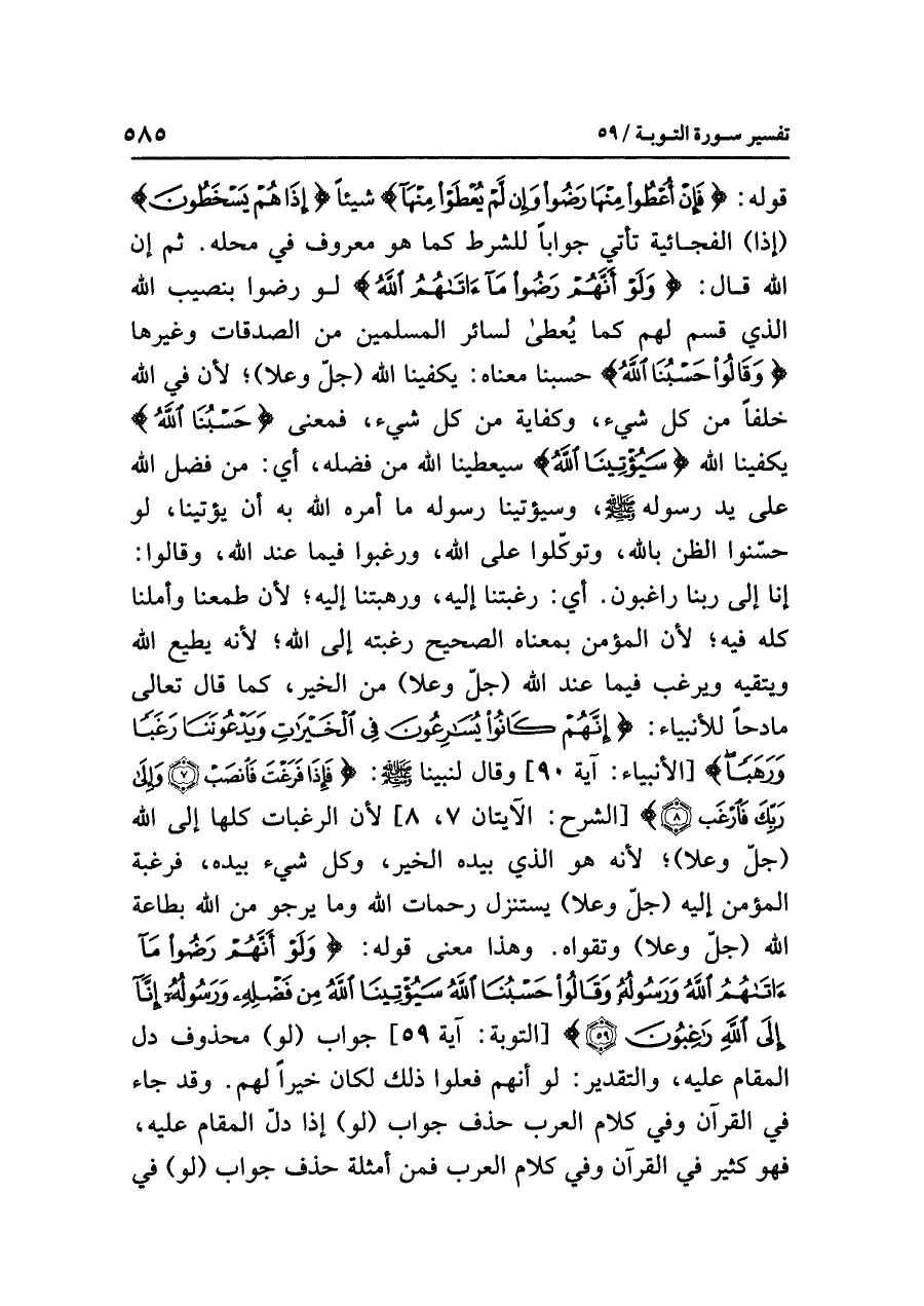 ثم إن اللَّهَ قال: {وَلَوْ أَنَّهُمْ رَضُوا مَا آتَاهُمُ اللَّهُ} لو رَضُوا بنصيبِ اللَّهِ الذي قَسَمَ لهم كما يُعْطَى لسائرِ المسلمينَ من الصدقاتِ وغيرِها {وَقَالُوا حَسْبُنَا اللَّهُ} حَسْبُنَا معناه: يَكْفِينَا اللَّهُ (جلَّ وعلا)؛ لأَنَّ فِي اللَّهِ خَلَفًا مِنْ كُلِّ شيءٍ، وكفايةٌ مِنْ كُلِّ شيءٍ، فمعنَى {حَسْبُنَا اللَّهُ} يَكْفِينَا اللَّهُ {سَيُؤْتِينَا اللَّهُ} سَيُعْطِينَا اللَّهُ من فَضْلِهِ، أي: مِنْ فضلِ اللَّهِ على يدِ رسولِه صلى الله عليه وسلم، وَسَيُؤْتِينَا رسولُه ما أَمَرَهُ اللَّهُ به أن يُؤْتِينَا، لو حَسَّنُوا الظنَّ بِاللَّهِ، وتوكلوا على الله، ورغبوا فيما عند الله، وقالوا: إنا إلى ربنا راغبون. أي: رَغْبَتُنَا إليه، ورهبتُنا إليه؛ لأن طَمَعَنَا وَأَمَلَنَا كُلَّهُ فيه؛ لأن المؤمنَ بمعناه الصحيحِ رغبتُه إلى اللَّهِ؛ لأنه يطيعُ اللَّهَ وَيَتَّقِيهِ وَيَرْغَبُ فيما عند الله (جلَّ وعلا) من الخيرِ، كما قال تعالى مَادِحًا للأنبياءِ: {إِنَّهُمْ كَانُوا يُسَارِعُونَ فِي الْخَيْرَاتِ وَيَدْعُونَنَا رَغَبًا وَرَهَبًا} [الأنبياء: آية ٩٠] وقال لنبينا صلى الله عليه وسلم: {فَإِذَا فَرَغْتَ فَانْصَبْ (٧) وَإِلَى رَبِّكَ فَارْغَبْ (٨)} [الشرح: الآيتان ٧، ٨] لأن الرغباتِ كُلَّهَا إلى اللَّهِ (جلَّ وعلا)؛ لأنه هو الذي بيدِه الخيرُ، وَكُلُّ شيءٍ بيدِه، فرغبةُ المؤمنِ إليه (جلَّ وعلا) يستنزلُ رحماتِ اللَّهِ وَمَا يرجو من اللَّهِ بطاعةِ اللَّهِ (جلَّ وعلا) وَتَقْوَاهُ. وهذا معنَى قولِه: {وَلَوْ أَنَّهُمْ رَضُوْا مَا آتَاهُمُ اللَّهُ وَرَسُولُهُ وَقَالُوا حَسْبُنَا اللَّهُ سَيُؤْتِينَا اللَّهُ مِنْ فَضْلِهِ وَرَسُولُهُ إِنَّا إِلَى اللَّهِ رَاغِبُونَ (٥٩)} [التوبة: آية ٥٩] جوابُ (لو) محذوفٌ دَلَّ المقامُ عليه، والتقديرُ: لو أنهم فَعَلُوا ذلك لكانَ خَيْرًا لهم.