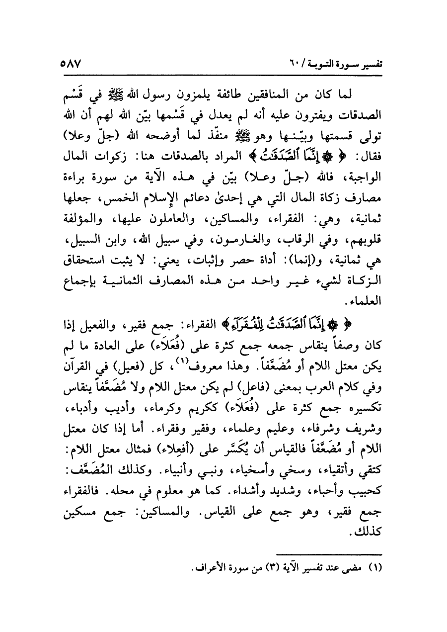 {إِنَّمَا الصَّدَقَاتُ لِلْفُقَرَاءِ} الفقراءُ: جَمْعُ فقيرٍ، والفعيلُ إذا كان وَصْفًا ينقاسُ جمعُه جمعَ كثرةٍ على (فُعَلَاءَ) على العادةِ ما لم يكن معتلَّ اللامِ أو مُضَعَّفًا. وهذا معروفٌ (¬١)، كُلُّ (فعيلٍ) في القرآنِ وفي كلامِ العربِ بمعنَى (فاعلٍ) لم يكن معتلَّ اللامِ ولا مُضَعَّفًا ينقاسُ تكسيرُه جمعُ كثرةٍ على (فُعَلَاءَ) ككريمٍ وكرماءَ، وأديبٍ وأدباءَ، وشريفٍ وشرفاءَ، وعليمٍ وعلماءَ، وفقيرٍ وفقراءَ. أما إذا كان معتلَّ اللامِ أو مُضَعَّفًا فالقياسُ أن يُكَسَّرَ على (أَفْعِلَاءَ) فمثالُ معتلِّ اللامِ: كَتَقِيٍّ وأتقياءَ، وَسَخِيٍّ وأسخياءَ، وَنَبِيٍّ وأنبياءَ. وكذلك الْمُضَعَّفُ: كحبيبٍ وأحباءَ، وشديدٍ وأشداءَ. كما هو معلومٌ في محلِّه. فالفقراءُ جمعُ فقيرٍ، وهو جَمْعٌ على القياسِ. والمساكينُ: جَمْعُ مسكينٍ كذلك.