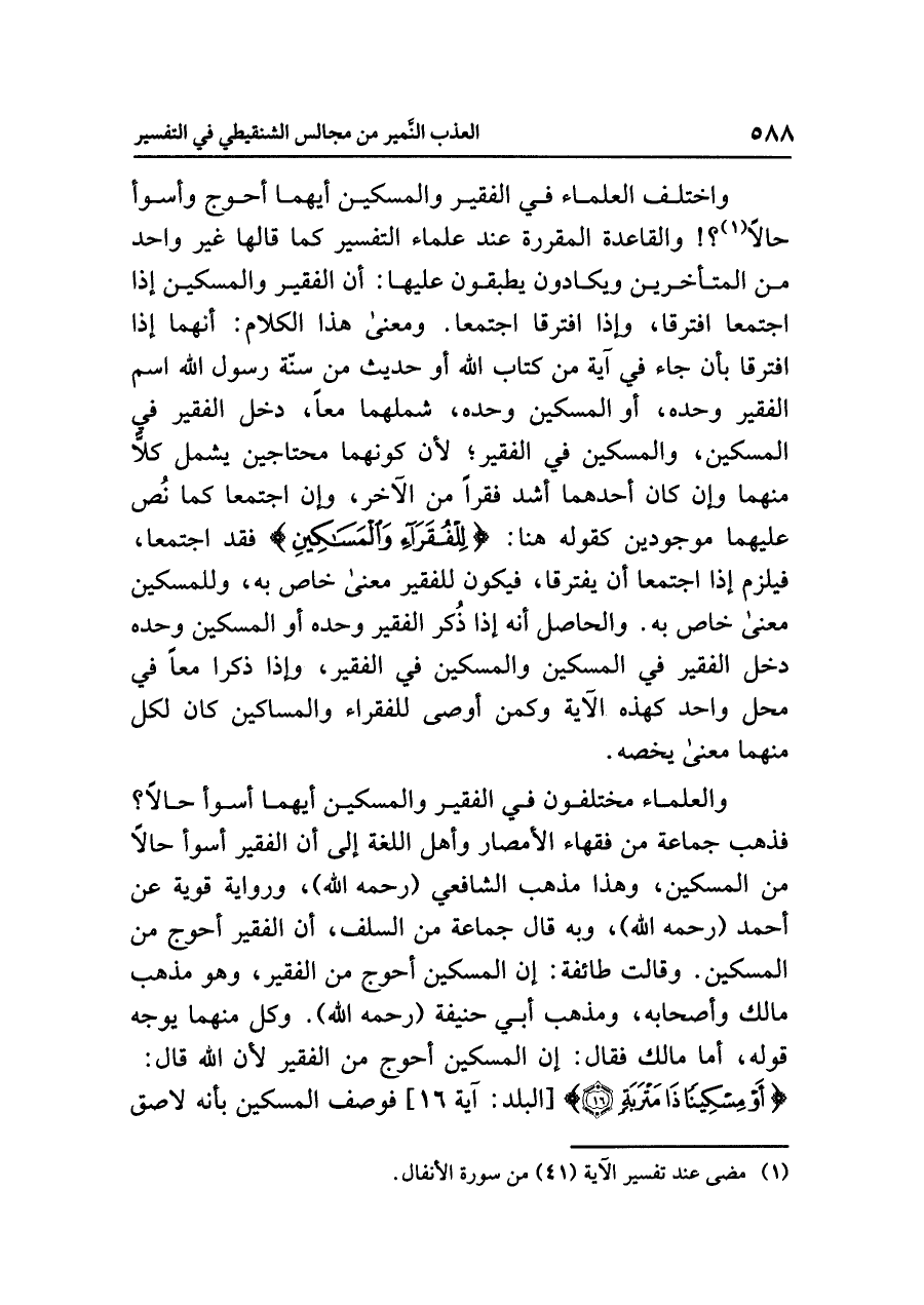 واختلفَ العلماءُ في الفقيرِ والمسكينِ أيهما أحوجُ وأسوأُ حالاً (¬١)؟! والقاعدةُ المقررةُ عند علماءِ التفسيرِ كما قَالَهَا غيرُ واحدٍ من المتأخرينَ ويكادونَ يُطْبِقُونَ عليها: أن الفقيرَ والمسكينَ إذا اجْتَمَعَا افْتَرَقَا، وإذا افْتَرَقَا اجْتَمَعَا. ومعنَى هذا الكلامِ: أنهما إذا افْتَرَقَا بأن جاءَ في آيةٍ من كتابِ اللَّهِ أو حديثٍ من سُنَّةِ رسولِ اللَّهِ اسمُ الفقيرِ وحدَه، أو المسكينِ وحدَه، شَمِلَهُمَا معًا، دخلَ الفقيرُ في المسكينِ، والمسكينُ في الفقيرِ؛ لأَنَّ كونَهما مُحْتَاجَيْنِ يشمل كُلاًّ منهما وإن كان أحدُهما أَشَدَّ فقرًا من الآخَرِ، وإن اجْتَمَعَا كما نُصَّ عليهما موجودينِ كقولِه هنا: {لِلْفُقَرَاءِ وَالْمَسَاكِينِ} فقد اجْتَمَعَا، فيلزمُ إذا اجتمعا أن يفترقَا، فيكونُ للفقيرِ معنًى خاصٌّ به، وللمسكينِ معنًى خاصٌّ به. والحاصلُ أنه إذا ذُكِرَ الفقيرُ وحدَه أو المسكينُ وحدَه دَخَلَ الفقيرُ في المسكينِ والمسكينُ في الفقيرِ، وإذا ذُكِرَا معًا في مَحَلٍّ واحدٍ كهذِه الآيةِ وَكَمَنْ أَوْصَى للفقراءِ والمساكينِ كان لكلٍّ منهما مَعْنًى يَخُصُّهُ.