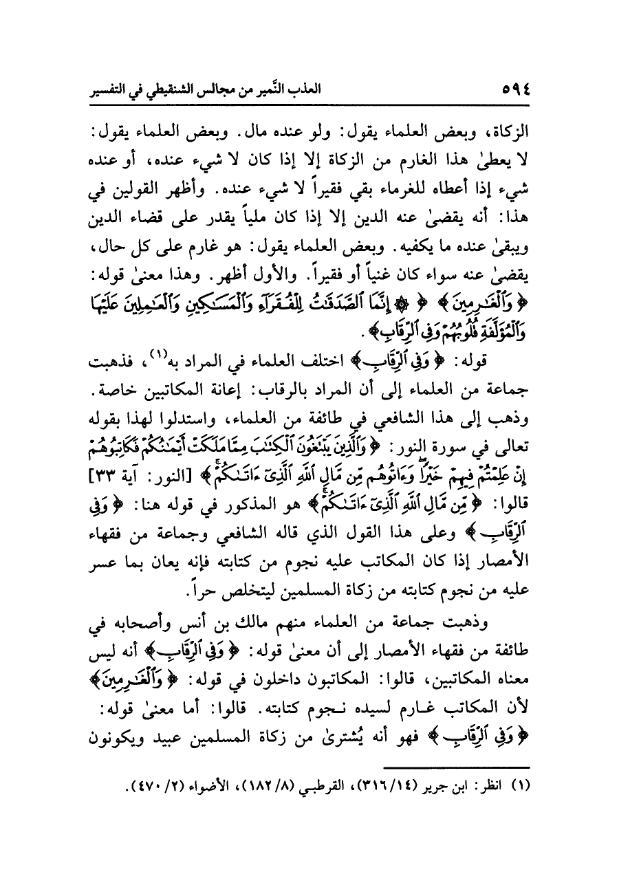 قولُه: {وَفِي الرِّقَابِ} اختلفَ العلماءُ في المرادِ به (¬١)، فَذَهَبَتْ جماعةٌ من العلماءِ إلى أن المرادَ بالرقابِ: إعانةُ الْمُكَاتَبِينَ خاصةً. وذهب إلى هذا الشافعيُّ في طائفةٍ من العلماءِ، واستدلُّوا لهذا بقولِه تعالى في سورةِ النورِ: {وَالَّذِينَ يَبْتَغُونَ الْكِتَابَ مِمَّا مَلَكَتْ أَيْمَانُكُمْ فَكَاتِبُوهُمْ إِنْ عَلِمْتُمْ فِيهِمْ خَيْرًا وَآتُوهُم مِّن مَّالِ اللَّهِ الَّذِي آتَاكُمْ} [النور: آية ٣٣] قالوا: {مِّن مَّالِ اللَّهِ الَّذِي آتَاكُمْ} هو المذكورُ في قولِه هنا: {وَفِي الرِّقَابِ} وعلى هذا القولِ الذي قاله الشافعيُّ وجماعةٌ من فقهاءِ الأمصارِ إذا كان المكاتبُ عليه نجومٌ من كتابتِه فإنه يُعَانُ بما عَسُرَ عليه من نجومِ كتابتِه من زكاةِ المسلمينَ ليتخلصَ حُرًّا.