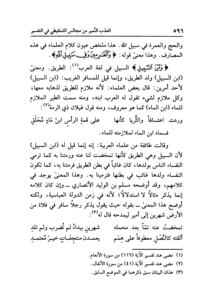 وقالت طائفةٌ من علماءِ العربيةِ: إنه إنما قيل له (ابنُ السبيلِ) لأن السبيلَ وهي الطريقُ كأنها تَمَخَّضَتْ لنا عنه وَرَمَتْنَا به كما ترمي النفساءُ الناسَ بولدِها، كان غَائِبًا في بطنِ الطريقِ فَرَمَتْنَا به، كما تكونُ النفساءُ ولدُها غائبٌ في بطنِها فترمينا به. وهذا المعنَى يوجدُ في كلامِهم، وقد أَوْضَحَهُ مسلمُ بنُ الوليدِ الأنصاريُّ - وإن كان كلامُه إنما يُذْكَرُ مثالاً لا استدلالاً، لأنه في زمنِ الدولةِ العباسيةِ، ولكنه أَوْضَحَ هذا المعنَى - بقولِه حيث يقولُ يذكرُ رجلاً سَافَرَ في فلاةٍ من الأرضِ شَهْرَيْنِ إلى أميرٍ ليمدحَه قال له (¬٣):