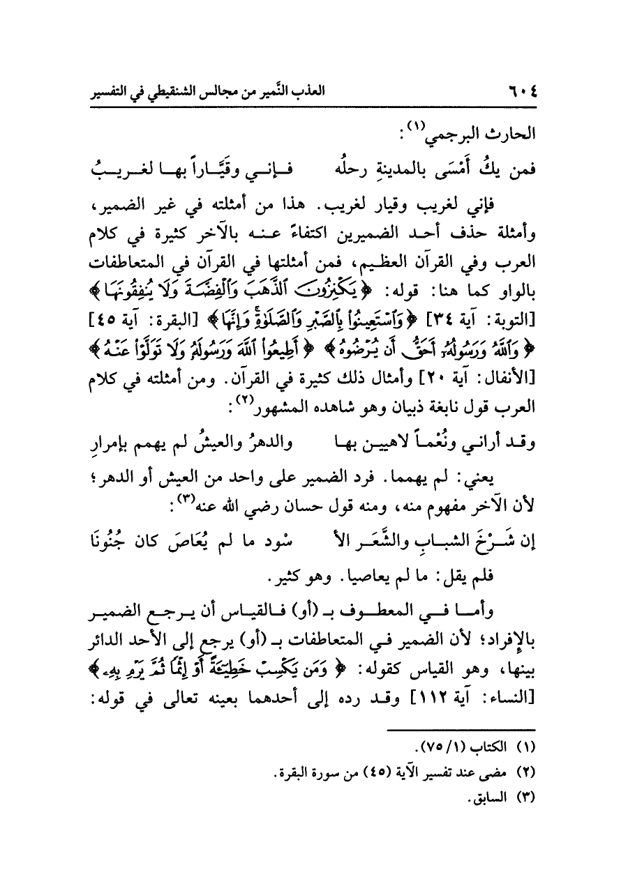 فإني لغريبٌ وقيارٌ لغريبٌ. هذا من أمثلتِه في غيرِ الضميرِ، وأمثلةُ حذفِ أحدِ الضميرينِ اكتفاءً عنه بالآخَرِ كثيرةٌ في كلامِ العربِ وفي القرآنِ العظيمِ، فَمِنْ أمثلتِها في القرآنِ في المتعاطفاتِ بالواوِ كما هنا: قولُه: {يَكْنِزُونَ الذَّهَبَ وَالْفِضَّةَ وَلَا يُنْفِقُونَهَا} [التوبة: آية ٣٤] {وَاسْتَعِينُوا بِالصَّبْرِ وَالصَّلَاةِ وَإنَّهَا} [البقرة: آية ٤٥] {وَاللَّهُ وَرَسُولُهُ أَحَقُّ أَنْ يُرْضُوهُ} {أَطِيعُوا اللَّهَ وَرَسُولَهُ وَلَا تَوَلَّوْا عَنْهُ} [الأنفال: آية ٢٠] وأمثالُ ذلك كثيرةٌ في القرآنِ. ومن أمثلتِه في كلامِ العربِ قولُ نابغة ذبيانَ وهو شاهدُه المشهورُ (¬٢):