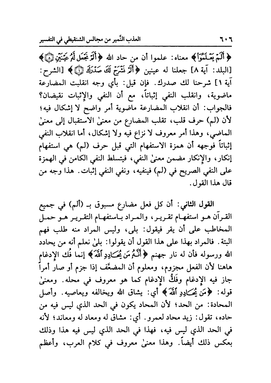 القولُ الثانِي: أن كُلَّ فعلٍ مضارعٍ مسبوقٍ بـ (ألم) في جميعِ القرآنِ هو استفهامُ تقريرٍ، والمرادُ باستفهامِ التقريرِ هو حَمْلُ المخاطَب على أن يُقِرَّ فيقول: بَلَى، وليس المرادُ منه طلبَ فَهْمٍ ألبتةَ. فالمرادُ بهذا على هذا القولِ أن يقولوا: بَلَى نعلمُ أنه من يُحَادِدِ اللَّهَ ورسولَه فأن له نارَ جهنمَ {أَنَّهُ مَنْ يُحَادِدِ اللَّهَ} إنما فُكَّ الإدغامُ هاهنا لأن الفعلَ مجزومٌ، ومعلومٌ أن المضعَّفَ إذا جُزِمَ أو صار أمرًا جَازَ فيه الإدغامُ وفَكُّ الإدغامِ كما هو معروفٌ في محلِّه. ومعنَى قولِه: {مَنْ يُحَادِدِ اللَّهَ} أي: يُشَاقِّ اللَّهَ ويخالفه ويعاصيه. وأصلُ المحادَّةِ: من الحدِّ؛ لأن المحادَّ يكونُ في الحدِّ الذي ليس فيه من حاده، تقول: زيد مُحَادٌّ لعمرو. أي: مشاقٌّ له ومعادٍ له ومعاندٌ؛ لأنه في الحدِّ الذي ليس فيه، فهذا في الحدِّ الذي ليس فيه هذا وذلك بعكس ذلك أيضًا. وهذا معنًى معروفٌ في كلامِ العربِ، وأعظمُ