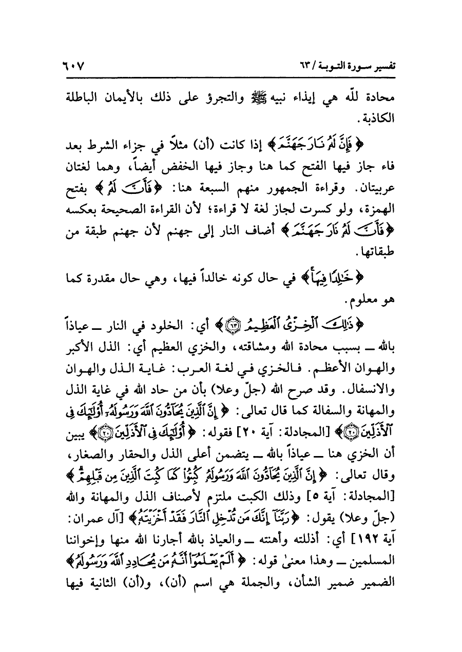 {ذَلِكَ الْخِزْيُ الْعَظِيمُ} أي: الخلودُ في النار- عياذا بالله - بسببِ مُحَادَّةِ اللَّهِ ومشاقتِه، والخزيُ العظيمُ أي: الذلُّ الأكبرُ والهوانُ الأعظمُ. فالخزيُ في لغةِ العربِ: غايةُ الذلِّ والهوانِ والانسفالِ. وقد صَرَّحَ اللَّهُ (جلَّ وعلا) بأن مَنْ حَادَّ اللَّهَ في غايةِ الذلِّ والمهانةِ والسفالةِ كما قال تعالى: {إِنَّ الَّذِينَ يُحَادُّونَ اللَّهَ وَرَسُولَهُ أُولَئِكَ فِي الأَذَلِّينَ (٢٠)} [المجادلة: آية ٢٠] فقولُه: {أُولَئِكَ فِي الأَذَلِّينَ} يُبَيِّنُ أن الخزيَ هنا - عياذًا بالله - يتضمنُ أعلى الذلِّ والحقارِ والصغارِ، وقال تعالَى: {إِنَّ الَّذِينَ يُحَادُّونَ اللَّهَ وَرَسُولَهُ كُبِتُوا كَمَا كُبِتَ الَّذِينَ مِنْ قَبْلِهِمْ} [المجادلة: آية ٥] وذلك الكبتُ ملتزمٌ لأصنافِ الذلِّ والمهانةِ، وَاللَّهُ (جل وعلا) يقولُ: {رَبَّنَا إِنَّكَ مَنْ تُدْخِلِ النَّارَ فَقَدْ أَخْزَيْتَهُ} [آل عمران: آية ١٩٢] أي: أَذْلَلْتَهُ وأهنتَه - والعياذُ بالله أَجَارَنَا اللَّهُ منها وإخوانَنا المسلمينَ - وهذا معنى قولِه: {أَلَمْ يَعْلَمُوا أَنَّهُ مَنْ يُحَادِدِ اللَّهَ وَرَسُولَهُ} الضميرُ ضميرُ الشأنِ، والجملةُ هي اسم (أن)، و (أن) الثانيةُ فيها