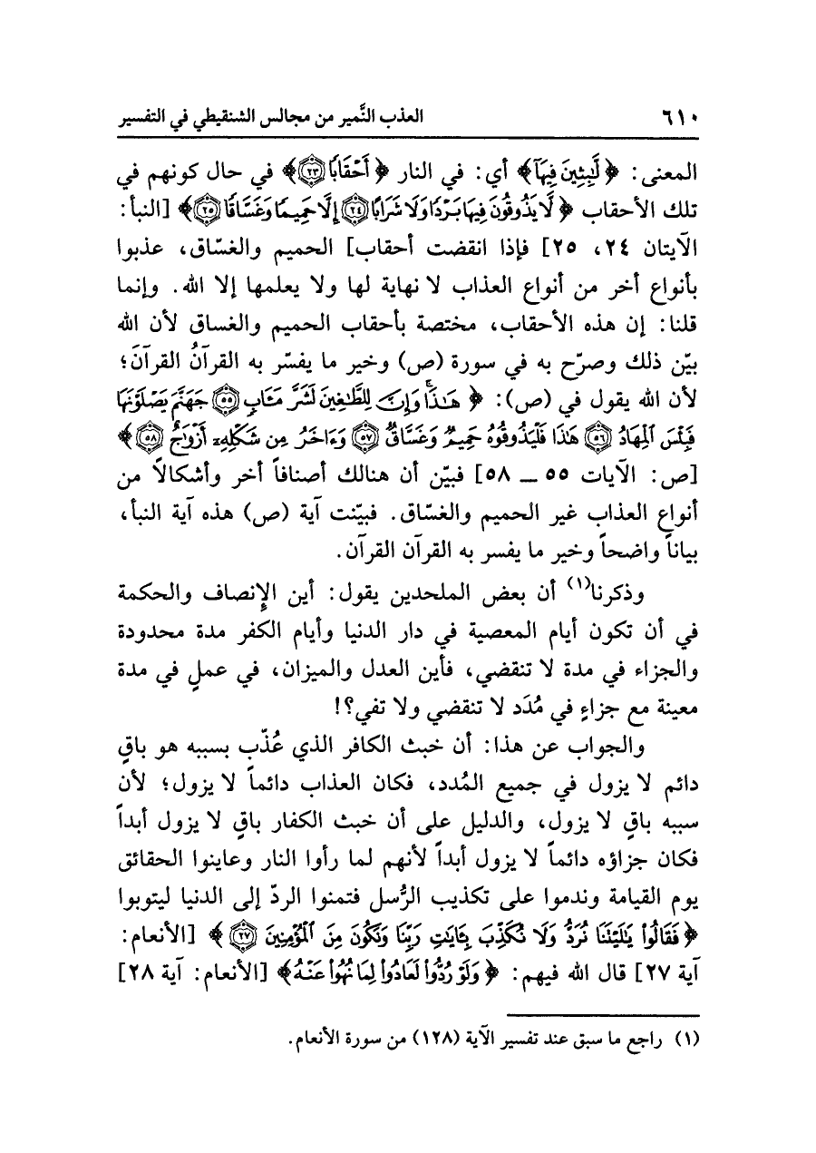 المعنَى: {لَابِثِينَ فِيهَا} أي: في النار {أَحْقَابًا} في حالِ كونِهم في تلك الأحقابِ {لَاّ يَذُوقُونَ فِيهَا بَرْدًا وَلَا شَرَابًا (٢٤) إِلَاّ حَمِيمًا وَغَسَّاقًا (٢٥)} [النبأ: الآيتانِ: ٢٤، ٢٥] فإذا انقضت أحقابُ] الحميمِ والغسَّاق، عُذِّبُوا بأنواعٍ أُخَرَ من أنواعِ العذابِ لا نهايةَ لها ولا يعلمُها إلا اللَّهُ. وإنما قُلْنَا: إن هذه الأحقابَ، مختصةٌ بأحقابِ الحميمِ والغساقِ لأن اللَّهَ بَيَّنَ ذلك وَصَرَّحَ به في سورةِ (ص) وخيرُ ما يُفَسَّرُ به القرآنُ القرآنُ؛ لأن الله يقول في (ص): {هَذَا وَإِنَّ لِلطَّاغِينَ لَشَرَّ مَآبٍ (٥٥) جَهَنَّمَ يَصْلَوْنَهَا فَبِئْسَ الْمِهَادُ (٥٦) هَذَا فَلْيَذُوقُوهُ حَمِيمٌ وَغَسَّاقٌ (٥٧) وَآخَرُ مِنْ شَكْلِهِ أَزْوَاجٌ (٥٨)} [ص: الآيات ٥٥ - ٥٨] فَبَيَّنَ أن هنالك أصنافًا أُخَرَ وأشكالاً من أنواعِ العذابِ غير الحميمِ والغسَّاقِ. فَبَيَّنَتْ آيةُ (ص) هذه آيةَ النبأ، بيانًا واضحًا، وخيرُ ما يُفَسَّرُ به القرآنُ القرآنُ.