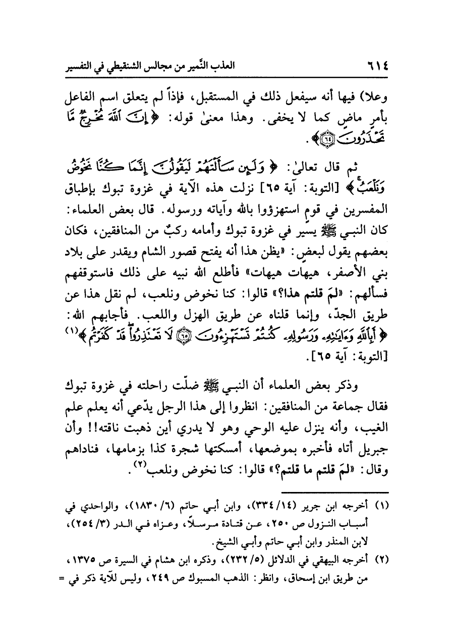 وذكر بعضُ العلماءِ أن النبيَّ صلى الله عليه وسلم ضَلَّتْ راحلتُه في غزوةِ تبوكَ فقال جماعةٌ من المنافقينَ: انْظُرُوا إلى هذا الرجلِ يَدَّعِي أنه يعلمُ علمَ الغيبِ، وأنه ينزلُ عليه الوحيُ وهو لا يدرِي أينَ ذَهَبَتْ ناقتُه!! وأن جبريلَ أتاه فأخبرَه بموضعِها، أَمْسَكَتْهَا شجرةُ كذا بِزِمَامِهَا، فناداهم وقال: «لِمَ قُلْتُمْ مَا قُلْتُمْ؟» قالوا: كنا نخوضُ ونلعبُ (¬٢).
