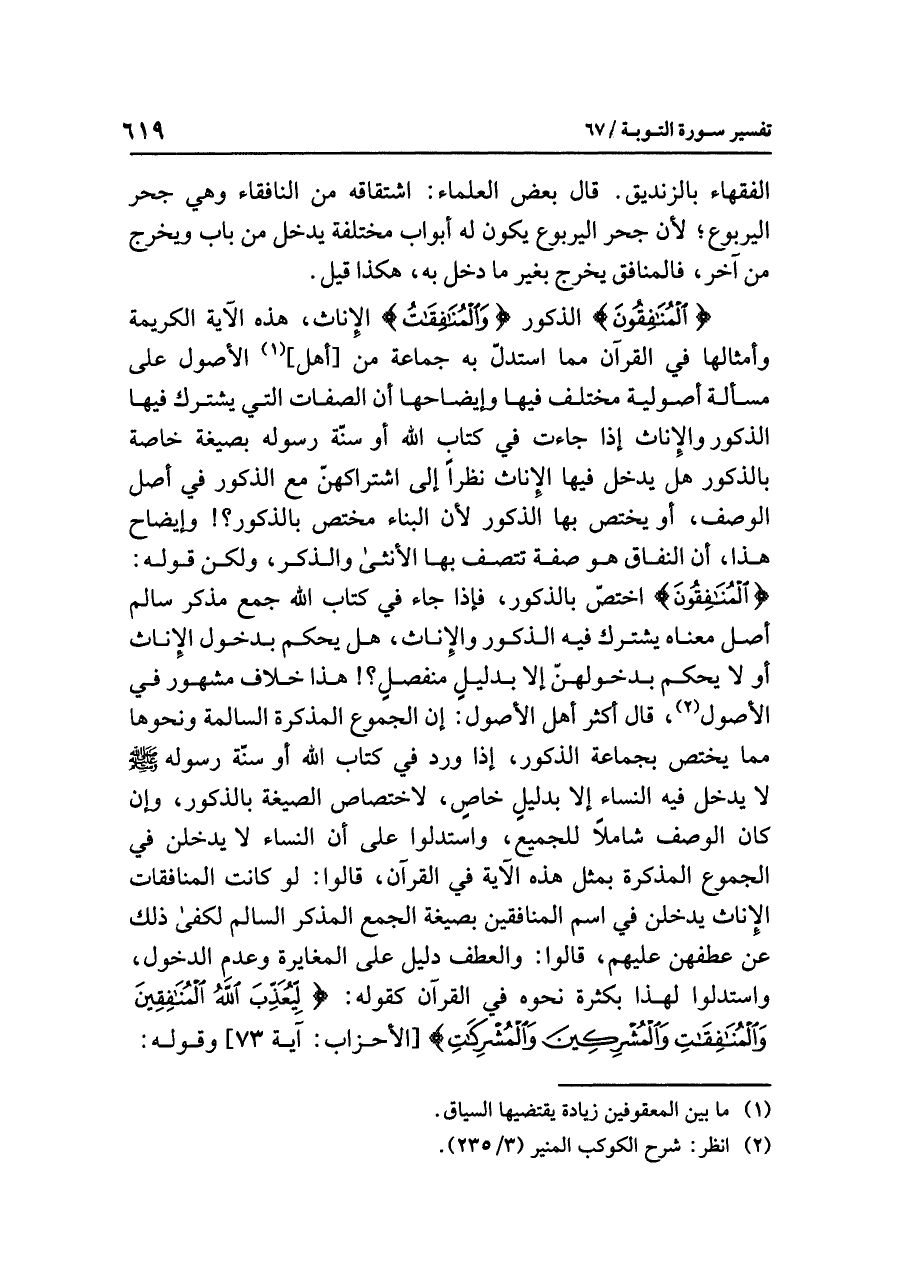 {الْمُنَافِقُونَ} الذكورُ {وَالْمُنَافِقَاتُ} الإناثُ، هذه الآيةُ الكريمةُ وأمثالُها في القرآنِ مما استدل به جماعةٌ من [أهلِ] (¬١) الأصولِ على مسألةٍ أصوليةٍ مختلفٍ فيها وإيضاحُها أن الصفاتِ التي يشتركُ فيها الذكورُ والإناثُ إذا جاءت في كتابِ اللَّهِ أو سنةِ رسولِه بصيغةٍ خاصةٍ بالذكورِ فهل يدخلُ فيها الإناثُ نَظَرًا إلى اشتراكِهن مع الذكورِ في أصلِ الوصفِ، أو يختصُّ بها الذكورُ لأن البناءَ مختصٌّ بالذكورِ؟! وإيضاحُ هذا، أن النفاقَ هو صفةٌ تتصفُ بها الأُنْثَى والذكرُ، ولكن قولَه: {الْمُنَافِقُونَ} اختصَّ بالذكورِ، فإذا جاء في كتابِ اللَّهِ جمعُ مذكرٍ سالمٌ أصلُ معناه يشتركُ فيه الذكورُ والإناثُ، هل يُحْكَمُ بدخولِ الإناثِ أو لا يُحْكَمُ بدخولهنَّ إلا بدليلٍ منفصلٍ؟! هذا خلافٌ مشهورٌ في الأصولِ (¬٢)، قال أكثرُ أهلِ الأصولِ: إن الجموعَ المذكرةَ السالمةَ ونحوَها مما يختصُّ بجماعةِ الذكورِ، إذا وَرَدَ في كتابِ اللَّهِ أو سُنَّةِ رسولِه صلى الله عليه وسلم لا يدخلُ فيه النساءُ إلا بدليلٍ خَاصٍّ، لاختصاصِ الصيغةِ بالذكورِ، وإن كان الوصفُ شاملاً للجميعِ، واستدلُّوا على أن النساءَ لَا يَدْخُلْنَ في الجموعِ المذكرةِ بمثلِ هذه الآيةِ في القرآنِ، قالوا: لو كانت المنافقاتُ الإناثُ يَدْخُلْنَ في اسمِ المنافقينَ بصيغةِ الجمعِ المذكرِ السالمِ لَكَفَى ذلك عن عطفِهن عليهم، قالوا: والعطفُ دليلُ المغايرةِ وعدمِ الدخولِ، واستدلوا لهذا بكثرةِ نَحْوِهِ في القرآنِ كقولِه: {لِيُعَذِّبَ اللَّهُ الْمُنَافِقِينَ وَالْمُنَافِقَاتِ وَالْمُشْرِكِينَ وَالْمُشْرِكَاتِ} [الأحزاب: آية ٧٣] وقولِه: