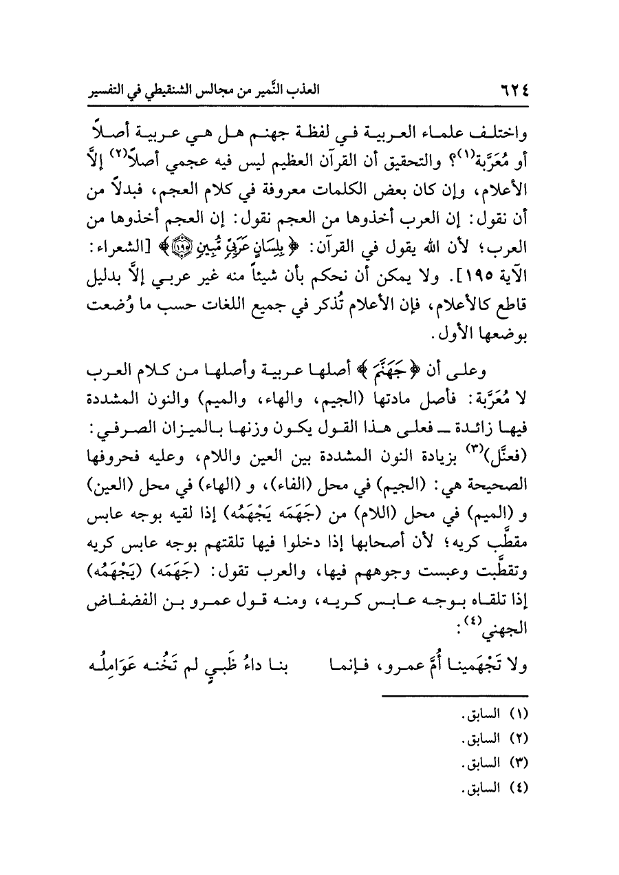 واختلف علماءُ العربيةِ في لفظةِ جهنمَ هل هي عربيةٌ أصلاً أو مُعَرَّبَةٌ (¬١)؟ والتحقيقُ أن القرآنَ العظيمَ ليس فيه عجميٌّ أصلاً (¬٢) إلَاّ الأعلام، وإن كان بعضُ الكلماتِ معروفةً في كلامِ العجمِ، فبدلاً من أن نقولَ: إن العربَ أخذوها من العجمِ نقولُ: إن العجمَ أخذوها من العربِ؛ لأن اللَّهَ يقولُ في القرآنِ: {بِلِسَانٍ عَرَبِيٍّ مُّبِينٍ (١٩٥)} [الشعراء: الآية ١٩٥]. ولا يمكنُ أن نحكمَ بأن شيئًا منه غيرُ عربيٍّ إلَاّ بدليلٍ قاطعٍ كالأعلامِ، فإن الأعلامَ تُذَكَّرُ في جميعِ اللغاتِ حسب ما وُضِعَتْ بوضعِها الأولِ.