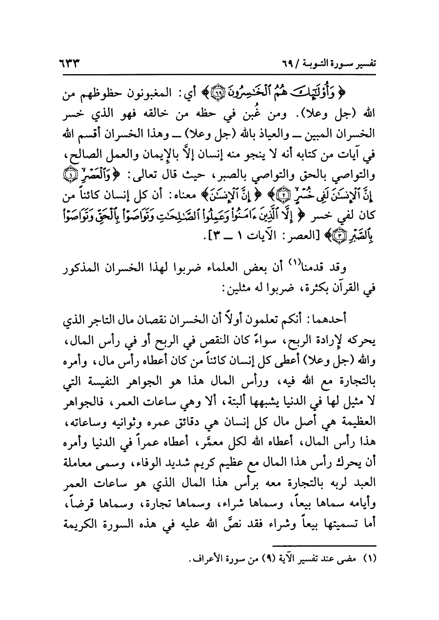 أحدُهما: أنكم تعلمون أولاً أن الخسرانَ نقصانُ مالِ التاجرِ الذي يُحَرِّكُهُ لإرادةِ الربحِ، سواءً كان النقصُ في الربحِ أو في رأسِ المالِ، وَاللَّهُ (جل وعلا) أَعْطَى كُلَّ إنسانٍ كائنًا مَنْ كان أعطاه رأسَ مالٍ، وَأَمَرَهُ بالتجارةِ مع الله فيه، ورأسُ المالِ هذا هو الجواهرُ النفيسةُ التي لا مثيلَ لها في الدنيا يشبُهها ألبتةَ، ألا وهي ساعاتُ العمرِ، فالجواهرُ العظيمةُ هي أصلُ مالِ كُلِّ إنسانٍ هي دقائقُ عمرِه وثوانيه وساعاتُه، هذا رأسُ المالِ، أعطاه كُلَّ معمَّر، أعطاه عمرًا في الدنيا وَأَمَرَهُ أن يحركَ رأسَ هذا المالِ مع عظيمٍ كريمٍ شديدِ الوفاءِ، وَسَمَّى معاملةَ العبدِ لربِّه بالتجارةِ معه برأسِ هذا المالِ الذي هو ساعاتُ العمرِ وأيامُه سَمَّاهَا بَيْعًا، وَسَمَّاهَا شراءً، وسماها تجارةً، وسماها قَرْضًا، أما تسميتُها بيعًا وشراءً فقد نَصَّ اللَّهُ عليه في هذه السورةِ الكريمةِ