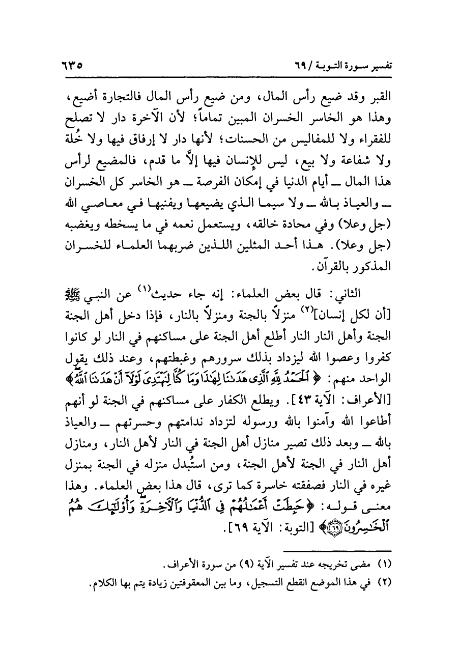 الثاني: قال بعضُ العلماءِ: إنه جاء حديثٌ (¬١) عن النبيِّ صلى الله عليه وسلم [أن لكلِّ إنسانٍ] (¬٢) منزلاً بالجنةِ ومنزلاً بالنارِ، فإذا دخلَ أهلُ الجنةِ الجنةَ وأهلُ النارِ النارَ أَطْلَعَ أهلَ الجنةِ على مساكنِهم في النارِ لو كانوا كَفَرُوا وَعَصَوُا اللَّهَ ليزدادَ بذلك سرورُهم وغبطتُهم، وعند ذلك يقولُ الواحدُ منهم: {الْحَمْدُ لِلَّهِ الَّذِي هَدَانَا لِهَذَا وَمَا كُنَّا لِنَهْتَدِيَ لَوْلَا أَنْ هَدَانَا اللَّهُ} [الأعراف: الآية ٤٣]. ويطلع الكفارُ على مساكنِهم في الجنةِ لو أنهم أَطَاعُوا اللَّهَ وآمنوا بالله ورسولِه لتزدادَ ندامتُهم وحسرتُهم - والعياذُ بِاللَّهِ - وبعدَ ذلك تصيرُ منازلُ أهلِ الجنةِ في النارِ لأهلِ النارِ، ومنازلُ أهلِ النارِ في الجنةِ لأهلِ الجنةِ، وَمَنِ اسْتُبْدِلَ منزلُه في الجنةِ بمنزلِ غيرِه في النارِ فصفقتُه خاسرةٌ كما ترى، قال هذا بعضُ العلماءِ. وهذا معنَى قولِه: {حَبِطَتْ أَعْمَالُهُمْ فِي الُّدنْيَا وَالآخِرَةِ وَأُولَئِكَ هُمُ الْخَاسِرُونَ (٦٩)} [التوبة: الآية ٦٩].