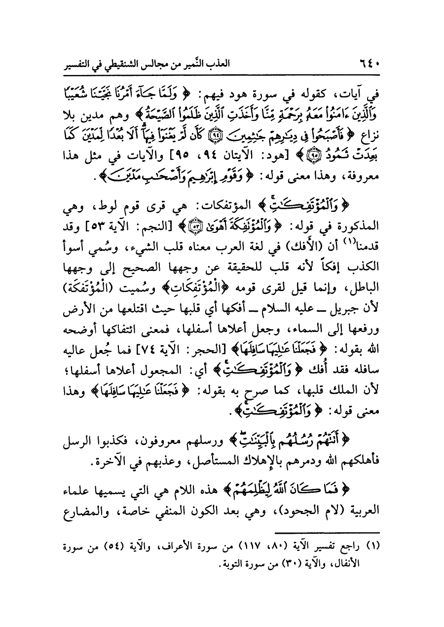 {وَالْمُؤْتَفِكَاتِ} المؤتفكاتُ: هي قُرَى قومِ لوطٍ، وهي المذكورةُ في قولِه: {وَالْمُؤْتَفِكَةَ أَهْوَى} [النجم: الآية ٥٣] وقد قدَّمنا (¬١) أن (الأفكَ) في لغةِ العربِ معناه قلبُ الشيءِ، وسُمِّيَ أسوأُ الكذبِ إِفْكًا لأنه قَلْبٌ للحقيقةِ عَنْ وَجْهِهَا الصحيحِ إلى وجهِها الباطلِ، وإنما قيل لِقُرَى قومِه {الْمُؤْتَفِكَاتِ} وَسُمِّيَتِ (المُؤْتَفَكَةَ) لأَنَّ جبريلَ - عليه السلامُ - أَفِكَهَا أي قَلَبَهَا حيث اقْتَلَعَهَا من الأرضِ وَرَفَعَهَا إلى السماءِ، وَجَعَلَ أعلاها أسفلَها، فمعنَى ائتفاكِها أَوْضَحَهُ اللَّهُ بقولِه: {فَجَعَلْنَا عَالِيَهَا سَافِلَهَا} [الحجر: الآية ٧٤] فما جُعِلَ عاليه سافلَه فقد أُفِكَ {وَالْمُؤْتَفِكَاتِ} أي: المجعول أعلَاها أسفلَها؛ لأن الْمَلَكَ قَلَبَهَا، كما صَرَّحَ به بقولِه: {فَجَعَلْنَا عَالِيَهَا سَافِلَهَا} وهذا معنَى قولِه: {وَالْمُؤْتَفِكَاتِ}.