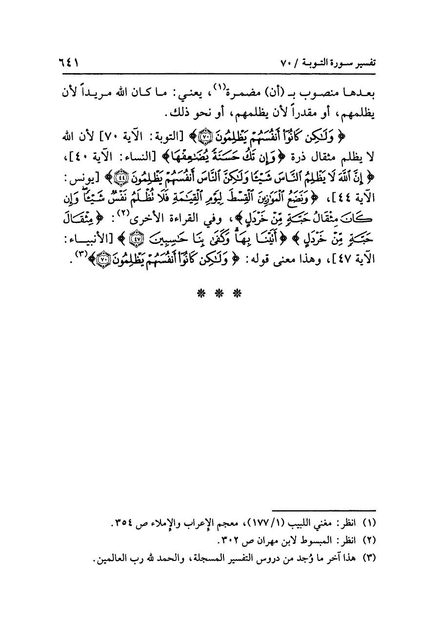 {وَلَكِنْ كَانُوا أَنْفُسَهُمْ يَظْلِمُونَ (٧٠)} [التوبة: الآية ٧٠] لأن اللَّهَ لَا يظلمُ مثقالَ ذرةٍ {وَإِنْ تَكُ حَسَنَةً يُضَاعِفْهَا} [النساء: الآية ٤٠]، {إِنَّ اللَّهَ لَا يَظْلِمُ النَّاسَ شَيْئًا وَلَكِنَّ النَّاسَ أَنْفُسَهُمْ يَظْلِمُونَ (٤٤)} [يونس: الآية ٤٤]، {وَنَضَعُ الْمَوَازِينَ الْقِسْطَ لِيَوْمِ الْقِيَامَةِ فَلَا تُظْلَمُ نَفْسٌ شَيْئًا وَإِنْ كَانَ مِثْقَالُ حَبَّةٍ مِّنْ خَرْدَلٍ} وفي القراءةِ الأخرى (¬٢): {مِثْقَالَ حَبَّةٍ مِّنْ خَرْدَلٍ} {أَتَيْنَا بِهَا وَكَفَى بِنَا حَاسِبِينَ (٤٧)} [الأنبياء: الآية ٤٧] وهذا معنَى قولِه: {وَلَكِنَّ النَّاسَ أَنفُسَهُمْ يَظْلِمُونَ (٤٤)} (¬٣).
