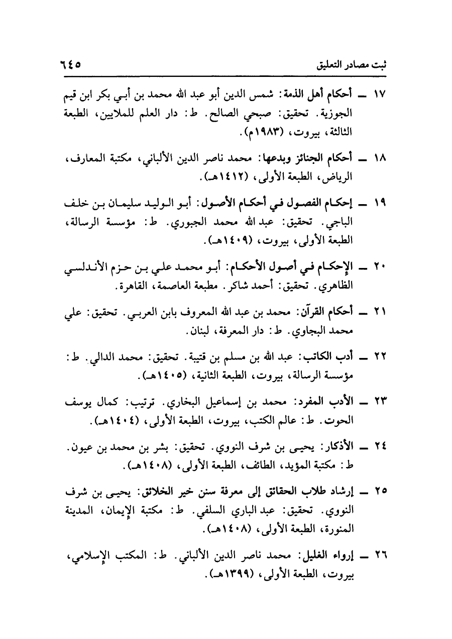 - إرشاد طلاب الحقائق إلى معرفة سنن خير الخلائق: يحيى بن شرف النووي. تحقيق: عبد الباري السلفي. ط: مكتبة الإيمان، المدينة المنورة، الطبعة الأولى، (١٤٠٨ هـ).