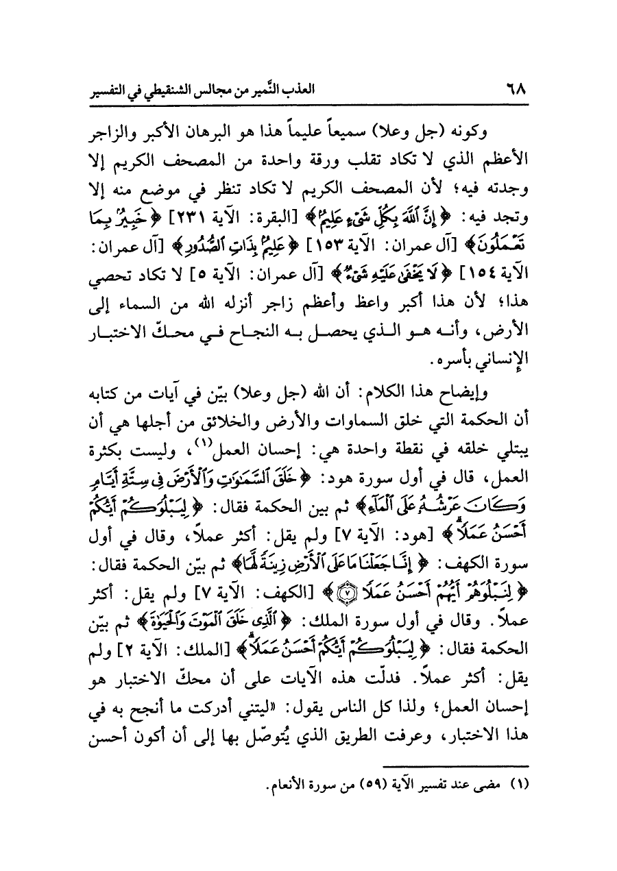 وإيضاح هذا الكلام: أن الله (جل وعلا) بَيَّنَ في آياتٍ مِنْ كِتَابِهِ أن الحكمة التي خلق السماوات والأرض والخلائق من أَجْلِهَا هي أن يبتلي خَلْقَهُ فِي نقطة واحدة هي: إحسان العمل (¬١)، وليست بكثرة العمل، قال في أول سورة هود: {خَلَق السَّمَاوَاتِ وَالأَرْضَ فِي سِتَّةِ أَيَّامٍ وَكَانَ عَرْشُهُ عَلَى الْمَاء} ثم بَيَّنَ الحِكْمَةَ فقال: {لِيَبْلُوَكُمْ أَيُّكُمْ أَحْسَنُ عَمَلاً} [هود: الآية ٧] ولم يقل: أكثر عملاً، وقال في أوَّلِ سورة الكهف: {إِنَّا جَعَلْنَا مَا عَلَى الأَرْضِ زِينَةً لَّهَا} ثم بيّن الحكمة فقال: {لِنَبْلُوَهُمْ أَيُّهُمْ أَحْسَنُ عَمَلاً} [الكهف: الآية ٧] ولم يقل: أكثر عملاً. وقال في أول سورة الملك: {الَّذِي خَلَقَ الْمَوْتَ وَالْحَيَاةَ} ثم بيّن الحكمة فقال: {لِيَبْلُوَكُمْ أَيُّكُمْ أَحْسَنُ عَمَلاً} [الملك: الآية ٢] ولم يقل: أكثر عملاً. فدلّت هذه الآيات على أن محكّ الاختبار هو إحسان العمل؛ ولذا كل الناس يقول: «ليتني أدركت ما أنجح به في هذا الاختبار، وعرفت الطريق الذي يُتوصّل بها إلى أن أكون أحسن