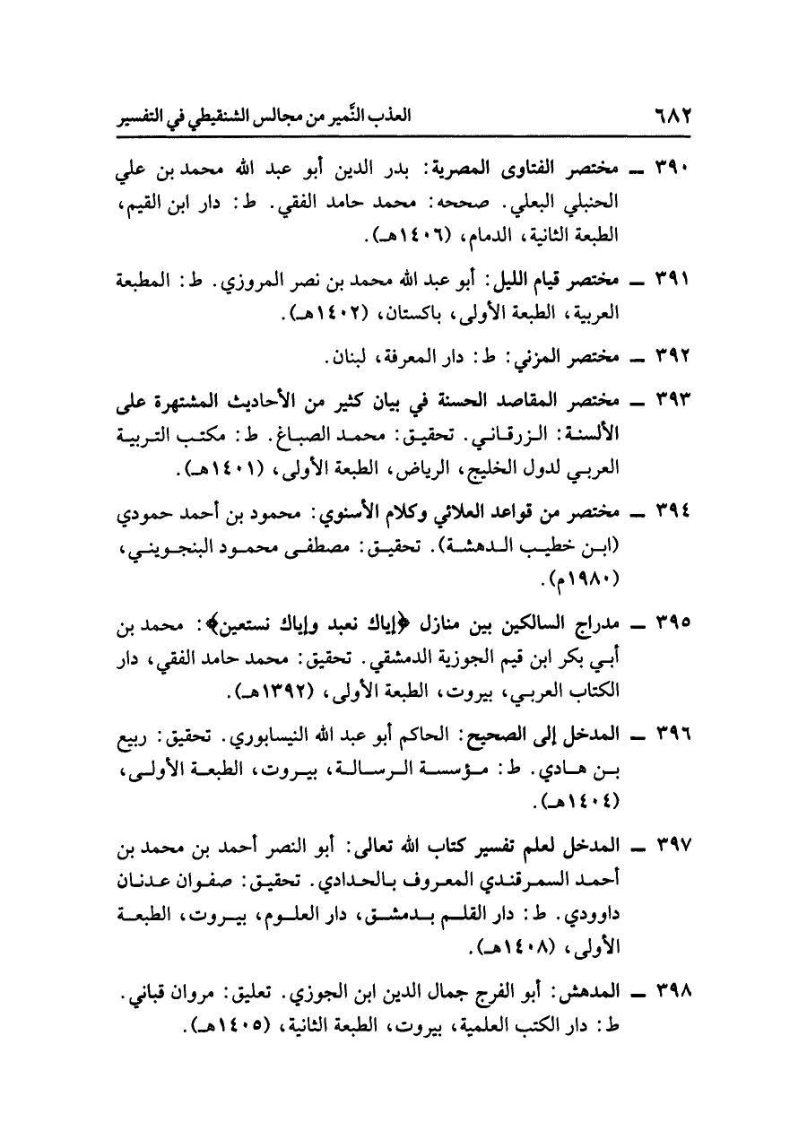 - مدراج السالكين بين منازل {إياك نعبد وإياك نستعين}: محمد بن أبي بكر ابن قيم الجوزية الدمشقي. تحقيق: محمد حامد الفقي. دار الكتاب العربي، بيروت، الطبعة الأولى، (١٣٩٢ هـ).